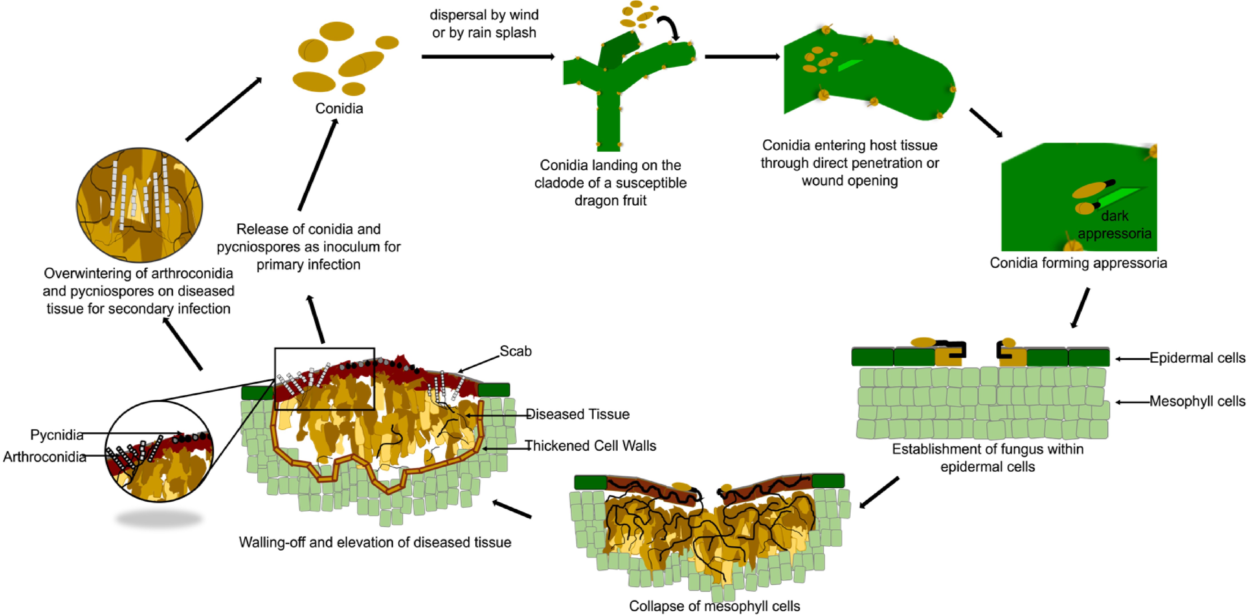 Infection by Neoscytalidium dimidiatum as an opportunistic pathogen occurs primarily through openings from freezing, heat stress, pruning wounds, mechanical injuries, or natural openings in the flowers, fruits, leaves, and shoots[15,29,43]. In dragon fruit canker disease, where the life cycle of N. dimidiatum has only been recently described (Fullerton et al.), it is initiated when dark appressoria form from surface hyphae growing from conidiospores[11]. When the fungus has successfully established itself within the epidermal cell, the host tissue manifests reddish-brown necrotic spots (Fig. 2). The collapse of infected cladode tissues follows this due to the clearing of mesophyll cells. As the lesion progresses, the cells adjacent to the collapsed tissue develop thickened walls, isolating the diseased area and forming elevated scabs. These scabs appear yellow, reddish, or gray, bearing dark pycnidia extruded with pycniospores available for dispersal by rain or wind[11]. Moreover, the arthroconidia and pycniospores on infected tissues may be overwintered and carried over for secondary infections[44].