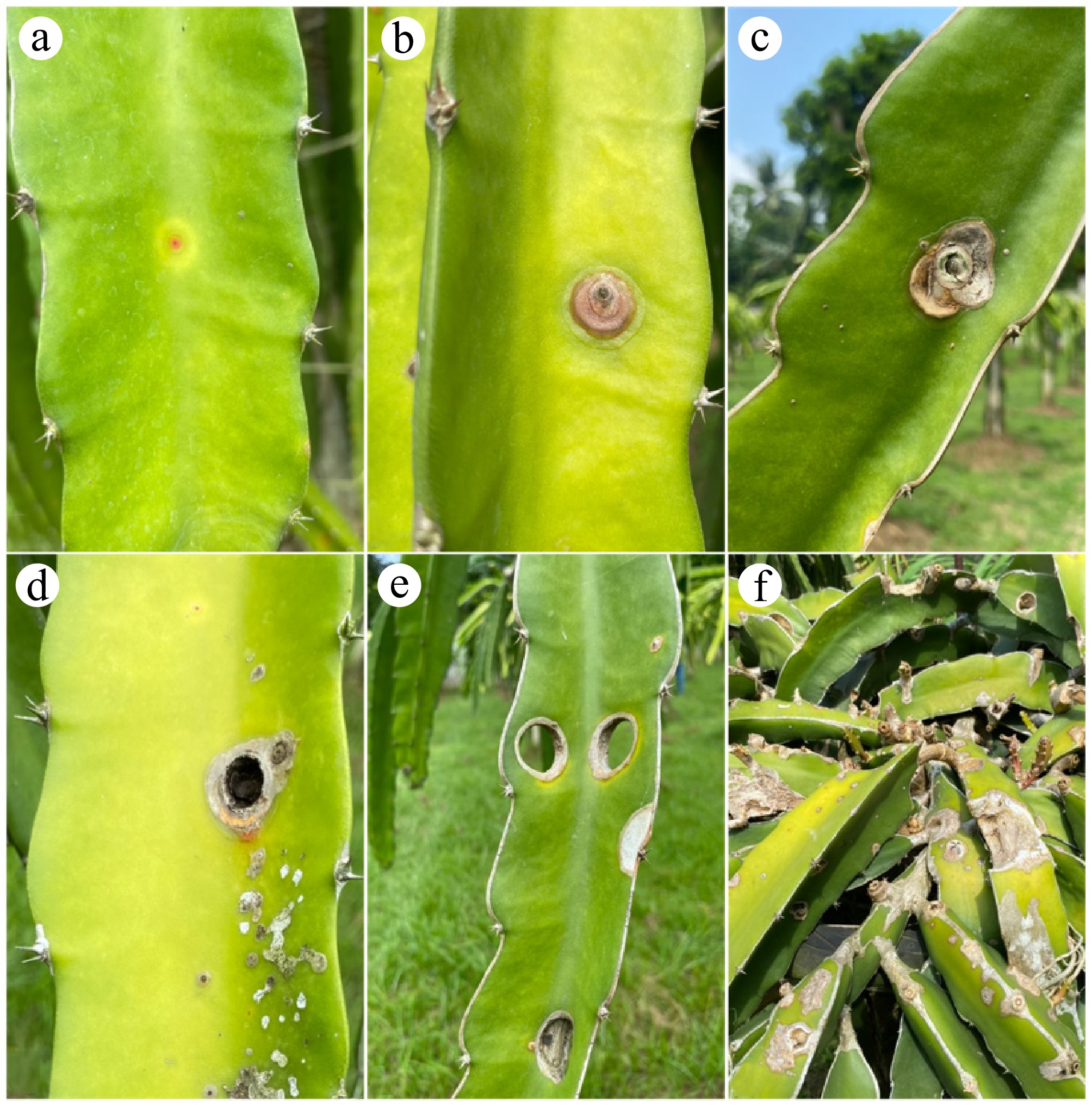 Development of stem canker disease caused by Neoscytalidium dimidiatum on Selenicereus spp. cladodes. Symptoms start as: (a) minute, reddish, chlorotic flecks, (b) that become raised, (c) and then collapse, forming the canker symptom of the disease, (d) black pycnidia may be produced, (e) the diseased tissue can fall off, forming the 'shot-hole symptom'. (f) Productivity is greatly affected in severely infected cladodes.