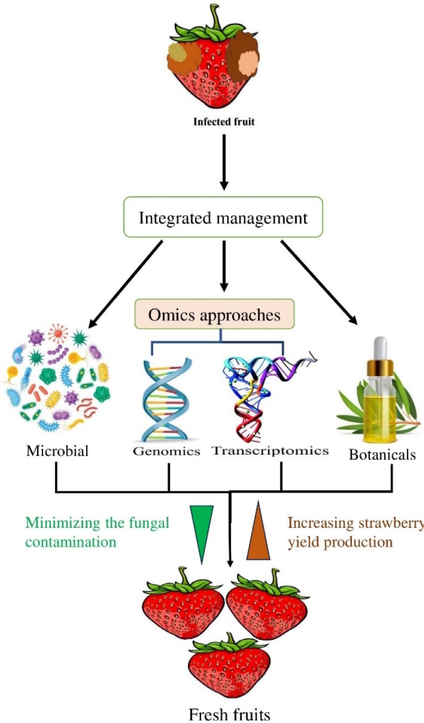 Ongoing research should focus on further integrating integrated approaches to explore SFR, which can cause tremendous economic losses. To overcome commercial, public, and environmental issues, this review provides insight into conventional, chemical, microbial, botanical, and omics-based strategies for enhancing the management of strawberry fruit rot diseases, with the aim of developing targeted and sustainable disease prevention approaches. It is important to study, research, and implement these innovative disease management techniques to reduce dependency on harmful chemicals and save the environment. By emphasizing holistic approaches and working on sustainable solutions, more resilient and compatible agroecosystems can be developed for forthcoming generations. Many botanicals have been found to potently combat fungal pathogens in strawberry plants, and further exploration of how to improve the shelf life of strawberry fruits has been performed. However, these botanicals were not tested for toxicity, and other regulatory measures require further investigation. Finally, omics studies such as genomics and transcriptomics have been conducted on strawberry fruit rot pathogens, but these studies have provided insight into only fundamental aspects and have been confined to only the laboratory level. In future research based on laboratory data, resistant fruit cultivars should be developed and evaluated for their resistance to pathogens in warehouse, storage, and field conditions so that they can be easily delivered to consumers. Such a strategy will be cost-effective and enhance fruit quality, thereby increasing acceptance among consumers.