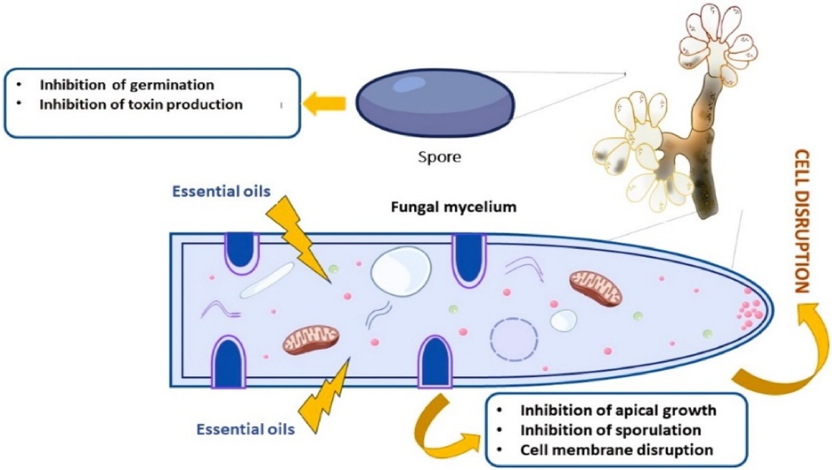 Disease Pathogens Essential oils Plant part use Effective dose Ref. Grey mold Botrytis cinerea Origanum onites L. Leaves 1.00 mL·L−1 [66] Ziziphora clinopodioides L. Leaves and flowers 2.00 mL·L−1 Thymus vulgaris Leaves and flowers 0.021% [67] Mentha longifolia Leaves 0.021% Mentha spicata Leaves 10% [68] Cymbopogon martini Leaves and flowers 10% Origanum heracleoticum Leaves and flowers 100 μL·L−1 [69] Thymus vulgraris Leaves and flowers 100 μL·L−1 Syzygium aromaticum Dried flower buds 92.56 μL·L−1 [70] Brassica nigra Seeds 15.42 μL·L−1 Solidago canadensis Inflorescence 0.1 mL·L−1 [71] Zataria multiflora Leaves 1,500 ppm [72] Leak mold Rhizopus stolonifera Mentha spicata Leaves 10% [68] Cymbopogon martini Leaves and flowers 10% Pelargonium graveolens Leaves 625 μL·L−1 [73] Cymbopogon citratus Leaves 500 μL·L−1 Foeniculum vulgare Seeds 800 μL·L−1 [74] Nigella sativa Seeds 800 μL·L−1 Pimpinella anisum Seeds 800 μL·L−1 Anthracnose Colletotrichum spp. Mentha longifolia Leaves and shoots − [75] Allium sativum Bulbs 1,700 μL·L−1 [65] Rosmarinus officinalis Leaves and flowers 700 μL·L−1 Cinnamon zeylanicum Inner bark 301.152 μL·L−1 [76] Satureja khuzestanica Leaves and flowers 550.803 μL·L−1 Aloysia citriodora Leaves − [77] Lippia alba Leaves − Ocimum americanum Leaves − According to laboratory tests, several essential oils exhibit potential efficacy against fungal pathogens and extend the shelf life of various fruits. Notably, essential oils from Origanum onites, Ziziphora clinopodioides, and Matricaria chamomilla were found to be effective against B. cinerea[66,67]. The mode of action of essential oils against pathogens can vary depending on the specific oil and chemical components, susceptibility of the pathogen, environmental conditions, and other factors. However, various effective mechanisms have been proposed, and several essential oils containing terpenoids and phenolics have antifungal properties and are able to disrupt fungal growth[67,68] including cell membrane integrity, respiration, and enzyme activity, ultimately leading to cell apoptosis or inhibition of spore germination (Fig. 2). Studies have reported that essential oils used as antifungal agents have detrimental impacts on cell morphology and ultrastructure (Fig. 2). EOs primarily target the cell membrane and its components; for instance, the EO of Solidago canadensis, applied at a concentration of 0.1 mL·L−1, alters the cellular structure and membrane permeability of B. cinerea[71]. EOs can enhance pathogen death under favorable conditions by altering the membrane potential, the transport of nutrients and ions, and the permeability of fungal cells. This result is supported by Ultee et al.[78] who explained that the lipophilic qualities of EOs support their ability to penetrate the plasma membrane, leading to the accumulation of polysaccharides under drought stress conditions and ultimately causing membrane disruption (Fig. 2).