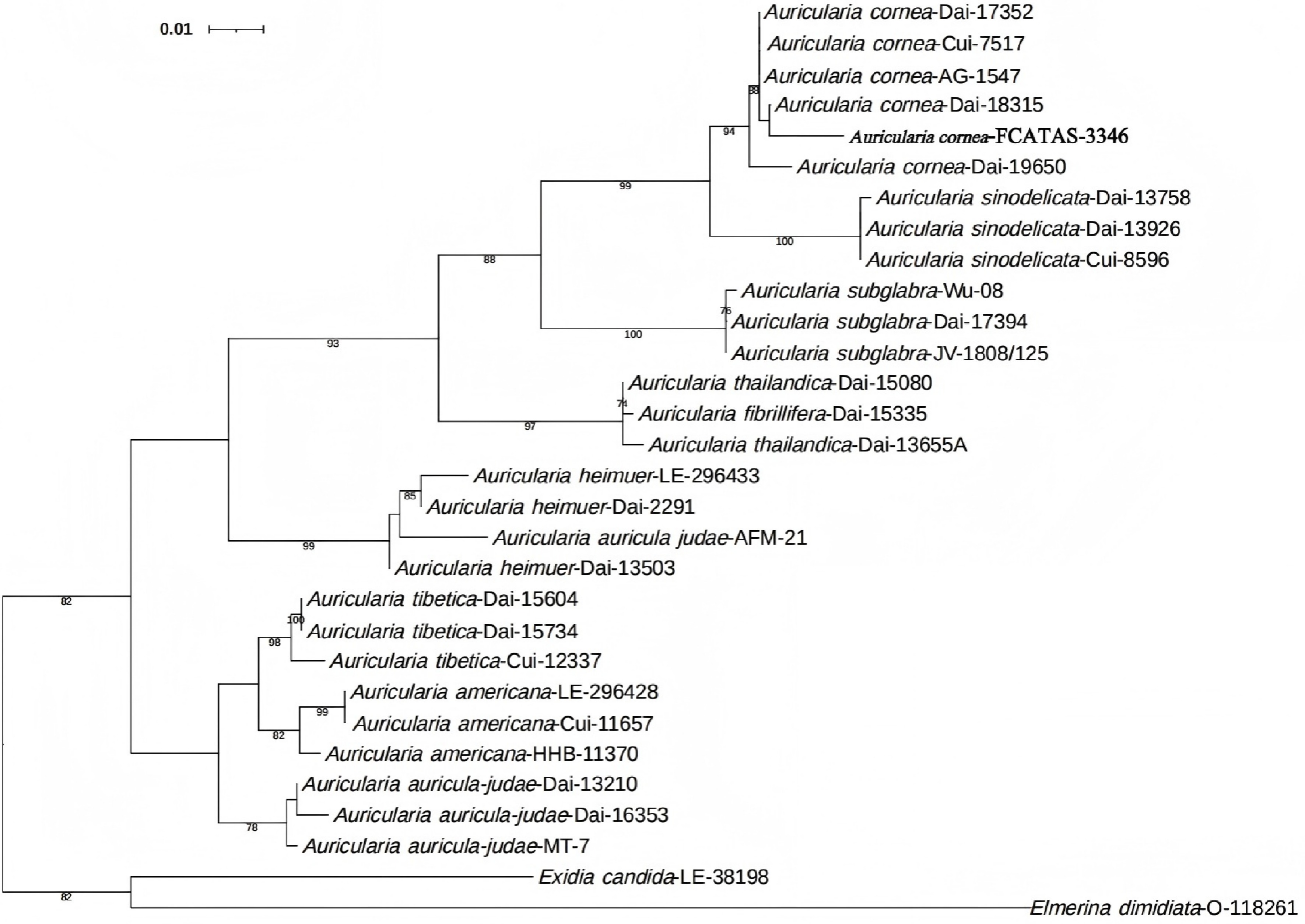 The preliminary identification of the specimen as A. cornea was conducted through morphological analysis of field-collected samples. For molecular verification, genomic DNA was extracted using the CTAB method, followed by amplification and sequencing of the internal transcribed spacer (ITS) region. The ITS primers and methods were selected in accordance with the study by Ma et al.[41]. A phylogenetic tree was subsequently constructed based on the obtained ITS sequences to ascertain its taxonomic position within the genus. The values of BS > 70% are indicated in the phylogenetic tree, and the self-tested sequences are all marked in bold[42].