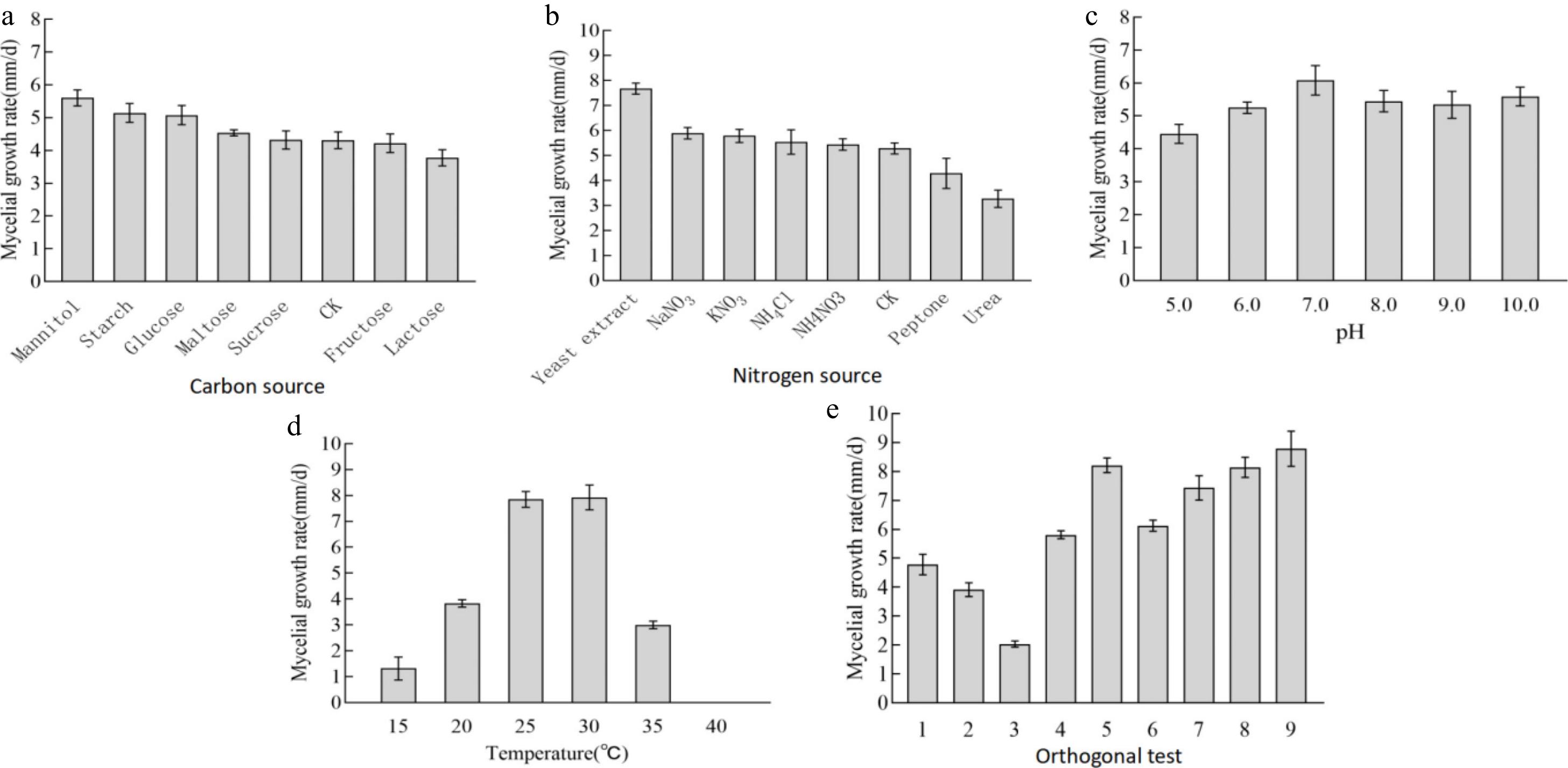 Mycelial growth rate under single factor and orthogonal conditions. (a) Carbon source; (b) nitrogen source; (c) pH; (d) temperature; (e) orthogonal test.