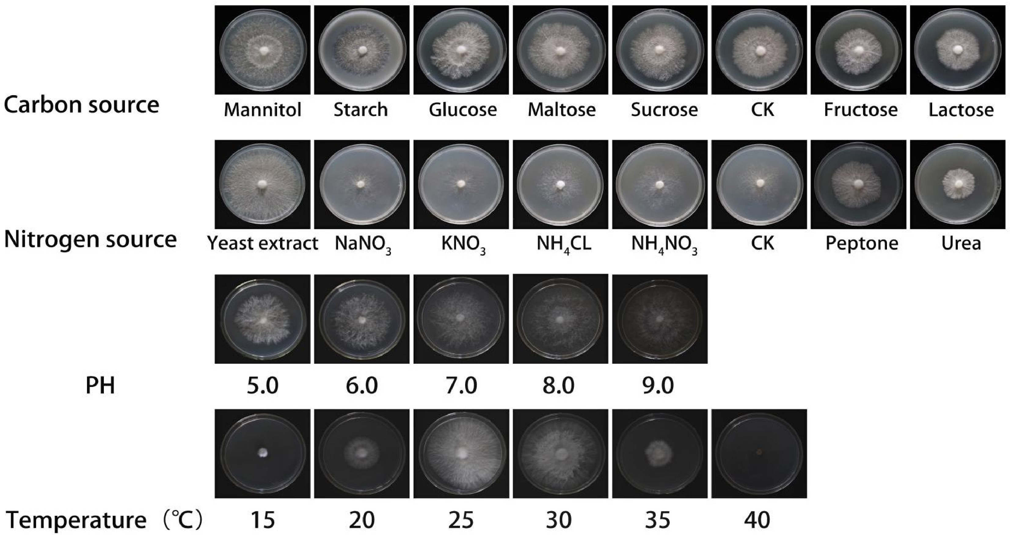 growth vigorCarbon source Mannitol 5.60 ± 0.10 a ++++ Starch 5.14 ± 0.12 b +++ Glucose 5.08 ± 0.12 b +++ Maltose 4.54 ± 0.04 c +++ Sucrose 4.32 ± 0.11 c +++ CK 4.31 ± 0.10 c +++ Nitrogen source Fructose 4.22 ± 0.16 c +++ Lactose 3.78 ± 0.10 d ++ Yeast extract powder 7.68 ± 0.09 a ++++ NaNO3 5.89 ± 0.09 b +++ KNO3 5.78 ± 0.11 bc +++ NH4Cl 5.54 ± 0.20 bcd +++ NH4NO3 5.44 ± 0.09 cd +++ CK 5.28 ± 0.09 d +++ Peptone 4.28 ± 0.25 e +++ Urea 3.27 ± 0.14 f ++ pH 5.0 4.46 ± 0.12 c +++ 6.0 5.25 ± 0.07 b +++ 7.0 6.08 ± 0.18 a ++++ 8.0 5.45 ± 0.13 b +++ 9.0 5.34 ± 0.16 b +++ 10.0 5.59 ± 0.12 b +++ Temperature (°C) 15 1.32 ± 0.18 d + 20 3.83 ± 0.06 b ++ 25 7.85 ± 0.12 a +++ 30 7.93 ± 0.20 a ++++ 35 3.00 ± 0.06 c ++ 40 0 e − −, no growth; +, very weak growth; ++, weak growth; +++, vigorous growth; ++++, very vigorous growth. Different lowercase and uppercase letters in the same column represent significant differences (p < 0.05). The same below. In the nitrogen source experiment (Figs 2b, 3 & Table 1), yeast extract powder was the most effective in promoting mycelial growth of A. cornea, followed by sodium nitrate, potassium nitrate, ammonium chloride, ammonium nitrate, peptone, and urea. Among them, the mycelial growth vigor showed dense, white, and strong in organic nitrogen sources, but relatively sparse, and weak in inorganic nitrogen sources. In yeast extract medium, the mycelial growth rate is fastest, white, and dense. Therefore, yeast extract powder is selected as the most suitable nitrogen source for mycelial growth.