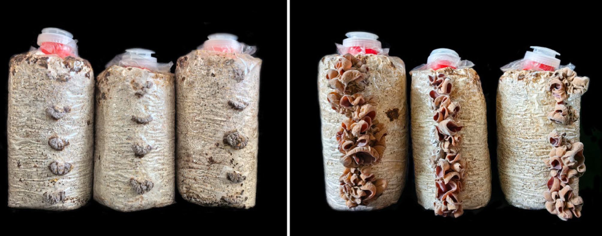 Auricularia cornea Ehrenb., a member of Basidiomycota[1], was previously cultivated and reported as A. polytricha (Mont.) Sacc. in almost all related Chinese reports until 2015[2−8]. It is widely distributed in Africa, Asia, Europe, North and South America[9]. This fungus is very important due to its edible value and medicinal properties[10−13]. Auricularia cornea is recognized as one of the seven principal cultivated edible and medicinal mushrooms in China[14−16]. In 2021, China's output of cultivated Auricularia accounted for over 90% of global production, with A. cornea being a predominant cultivated species within the genus[17,18]. The industrial production of edible mushrooms necessitates the establishment of optimal substrate and growth conditions for specific fungal strains[19−22]. These conditions encompass variations in temperature, and pH levels, as well as sources of carbon and nitrogen[23,24]. For example, optimal temperature and nitrogen source selection enhance microbial growth rates and product yields[25]. Furthermore, it is essential to recognize that not only do different fungal strains require distinct cultural conditions, but also that various strains of the same species may exhibit divergent requirements[26,27]. Therefore, it is imperative to conduct an in-depth study on screening optimal solid substrate conditions, which will provide a foundational understanding for the cultivation protocols of A. cornea.