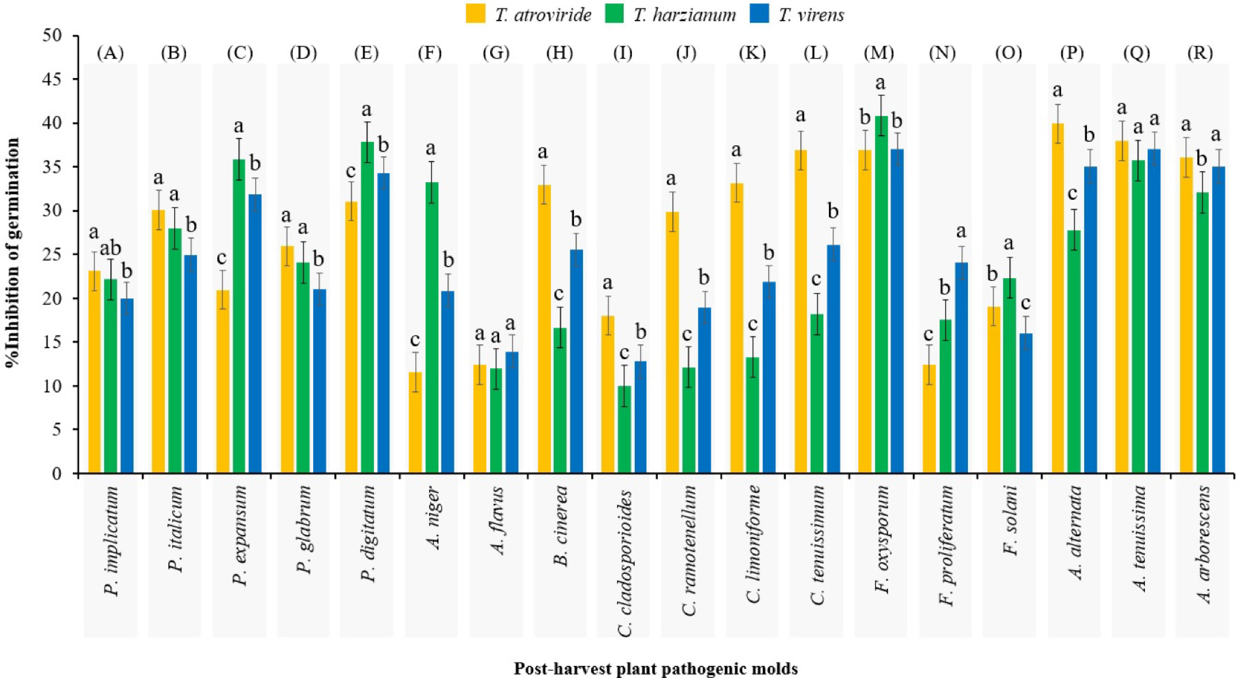 • The results demonstrate that the secondary metabolites derived from the initial spore germination stage of Trichoderma spp. actively inhibit the spore germination of all post-harvest plant pathogenic fungi. On average, T. atroviride, T. harzianum, and T. virens exhibited inhibitory activities of 27%, 24%, and 25%, respectively, against spore germination of 18 post-harvest fungal pathogens. According to the literature, secondary metabolites derived from the mycelial growth stage of Trichoderma spp. have shown efficacy against Penicillium spp.[18,20], Aspergillus spp.[14,15,20], B. cinerea[2022], Cladosporium spp.[20,23], Fusarium spp.[15,20,2426], and Alternaria spp.[27,28]. Although these studies, in line with our findings, highlight the significant bioactivity of Trichoderma spp. metabolites, none have investigated the compounds produced specifically during the spore germination stage.