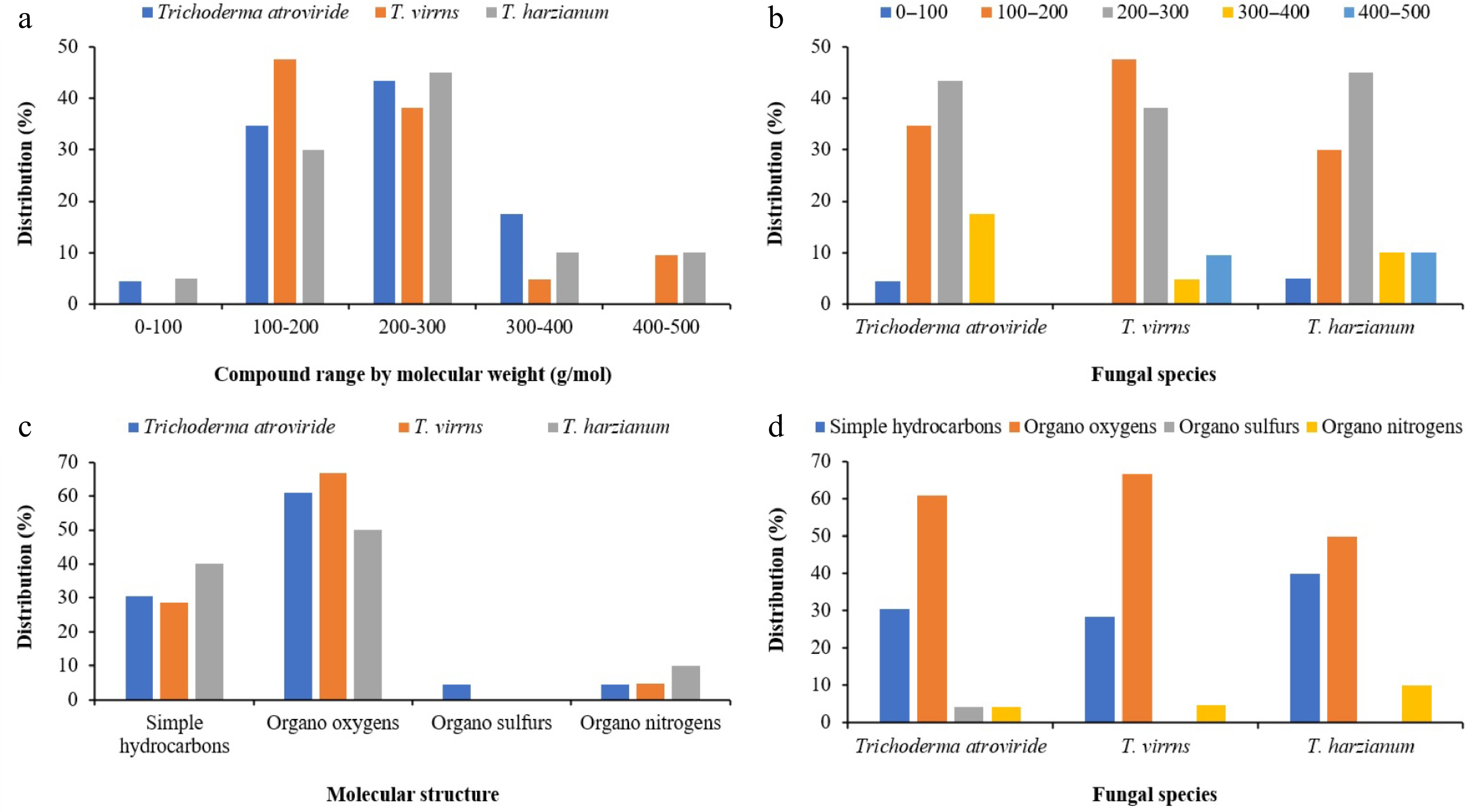 Clustered column charts illustrating the distribution percentages of various metabolites across Trichoderma spp. extracts based on GC-MS analysis. (a) and (b) represent the distribution percentages categorized by molecular weight. (c) and (d) display the distribution percentages classified by molecular structure.