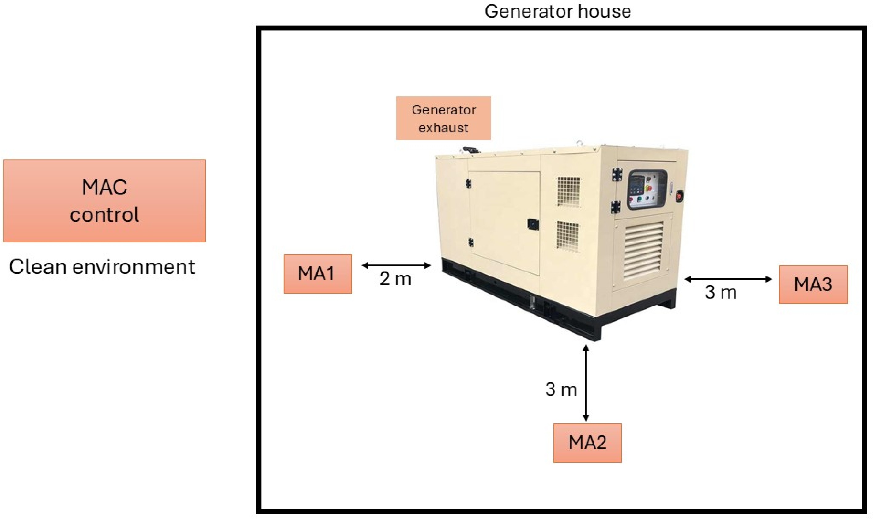 Experimental setup for pollutant exposure monitoring using oyster mushrooms (Pleurotus ostreatus). Three mushroom bags (MA 1 = 2 m; MA 2 and MA 3 = 3 m from the generator) were placed at different corners inside a roofed but open generator house near an operating diesel generator. A fourth bag (MAC) served as a control and was placed in a clean, well-ventilated indoor environment away from generator emissions.