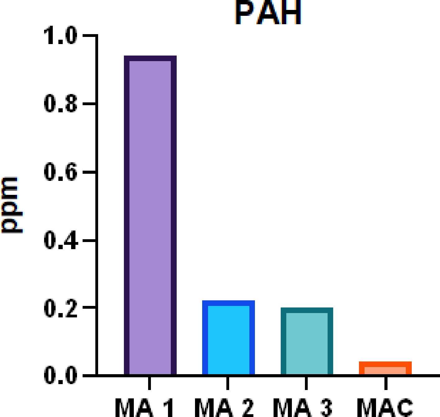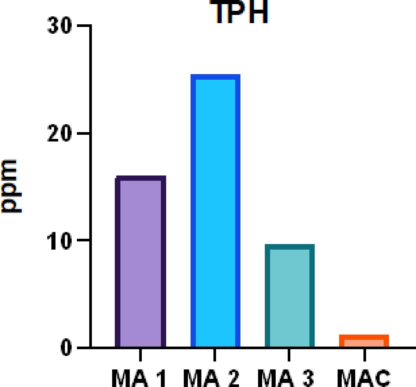 Concentrations of TPH in mushrooms placed at different distances (MA 1: 2 m; MA 2 and MA 3: both 3 m) within the generator house and the control mushroom (MAC). The values indicate the extent of hydrocarbon absorption, highlighting the influence of pollutant dispersion and airflow patterns.