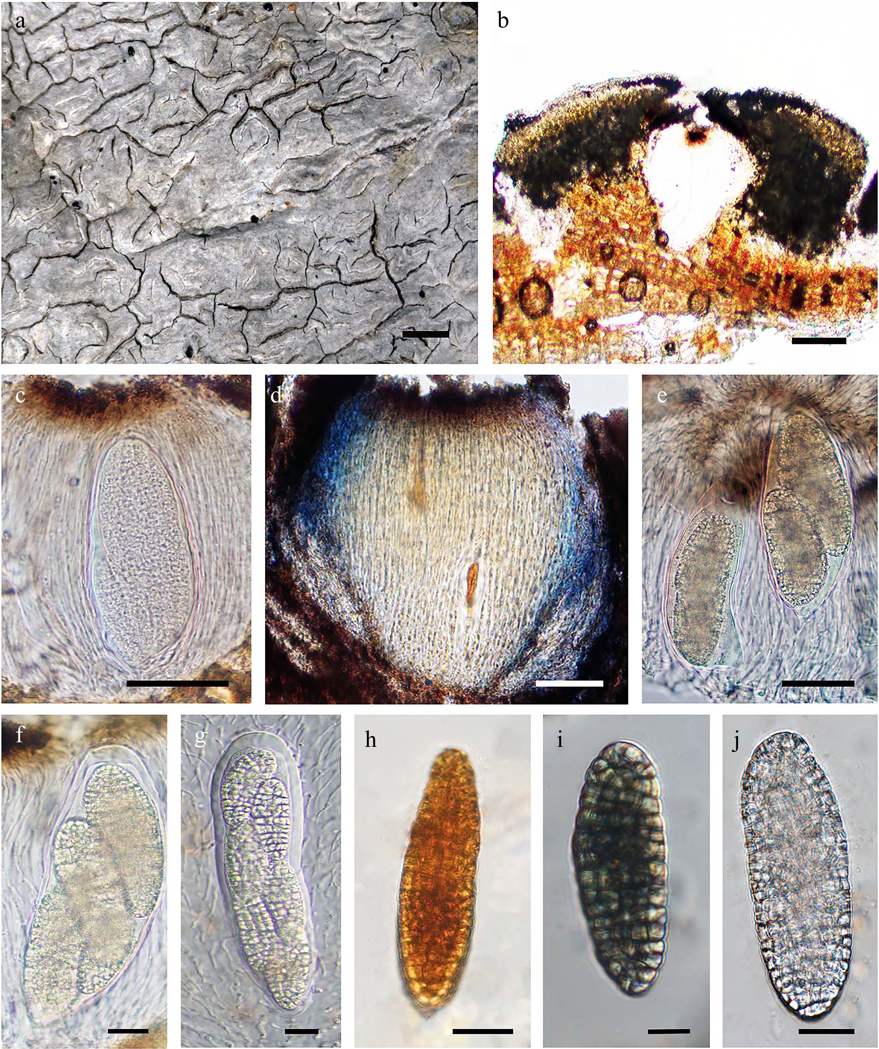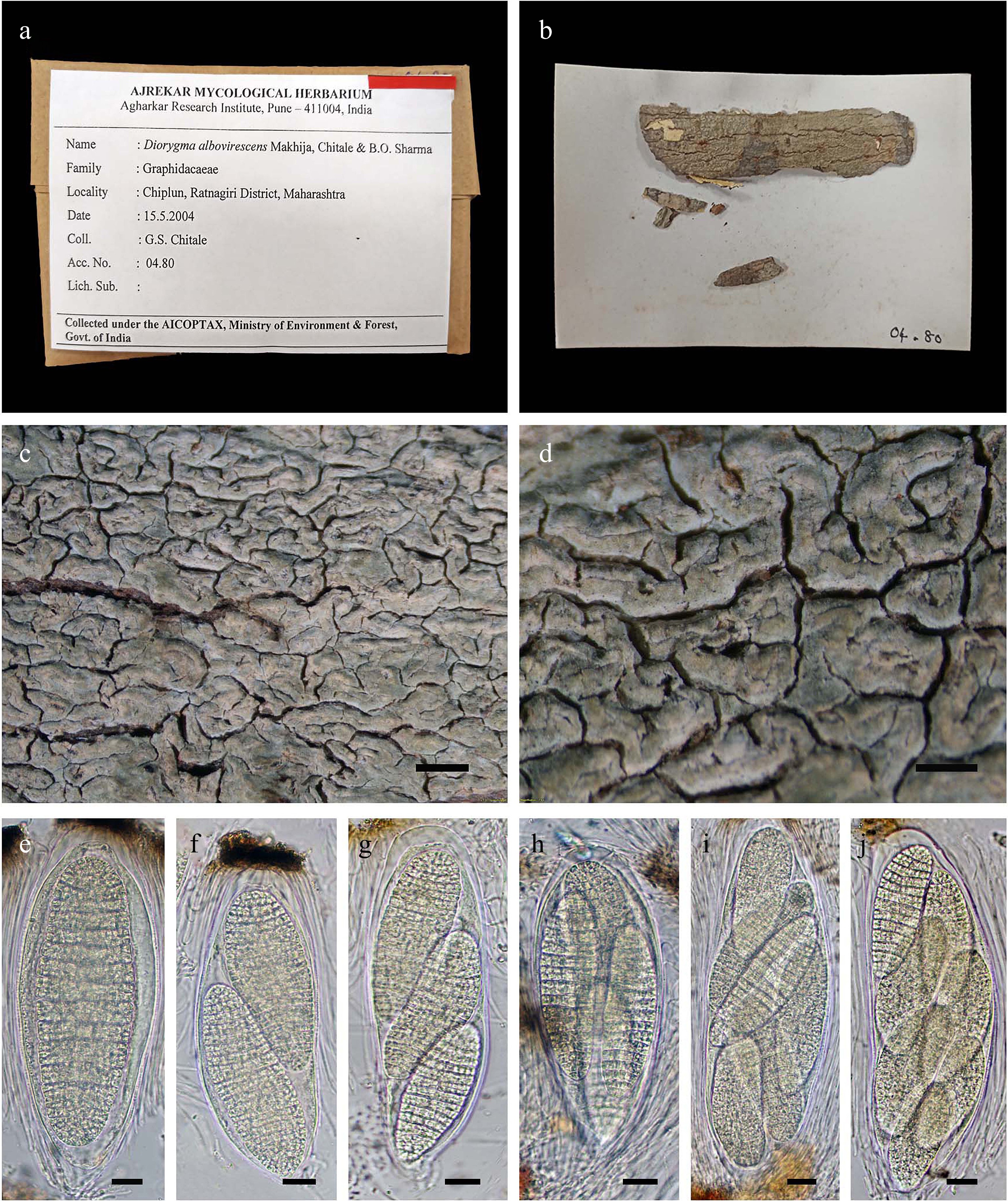 Diorygma albovirescens (holotype). (a), (b) Holotype herbarium material. (c), (d) Thallus. (e)–(j) Ascus showing ascospores. Scale bars: (c) = 1 mm, (d) = 500 μm, (e)–(j) = 20 μm.