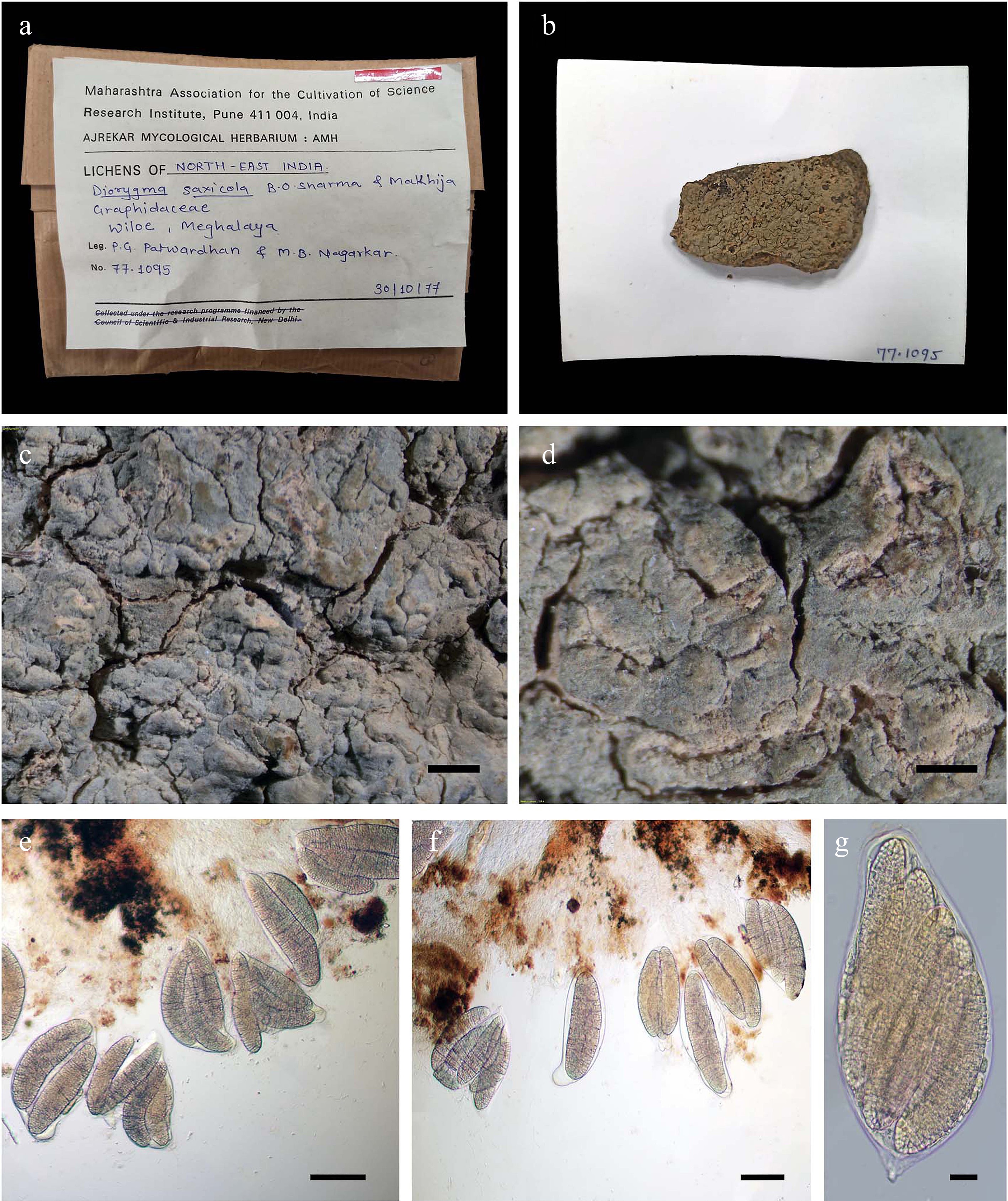 Diorygma saxicola (holotype). (a), (b) Holotype herbarium material. (c), (d) Thallus. (e)–(g) Ascus showing ascospores. Scale bars: (c) = 1 mm, (d) = 500 μm, (e), (f) = 100 μm, (g) = 20 μm.