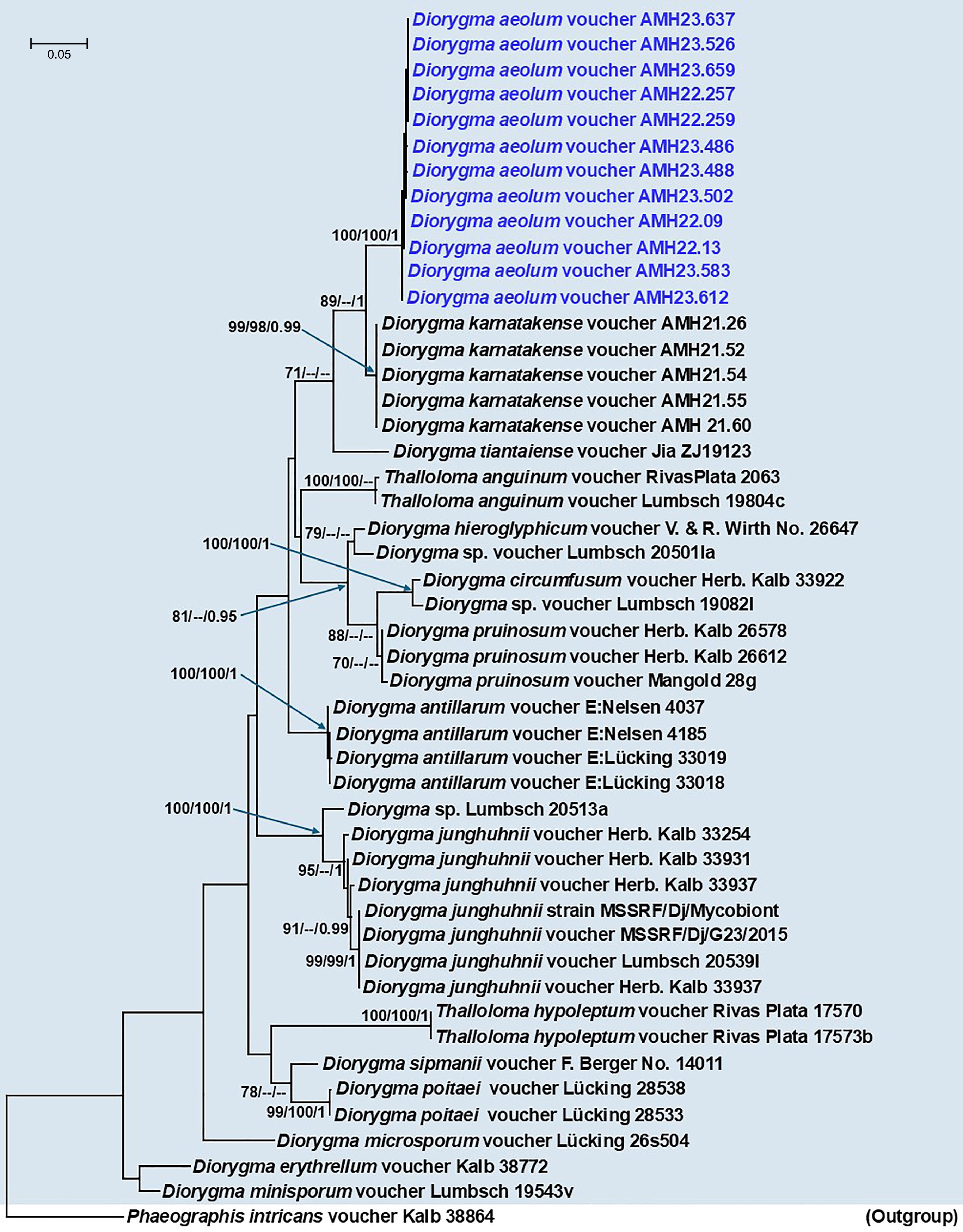 Phylogenetic tree generated from Maximum Likelihood (ML) analyses based on the combined mtSSU + nuLSU + RPB2 data for the genera Diorygma and Thalloloma species (Graphidaceae). Node support from 1,000 non-parametric bootstraps for RAxML (R-BS), IQ-TREE (UFboot-BS), and posterior probability (PP) from MrBayes are shown at the nodes (R-BS ≥ 70%/Ufboot-BS ≥ 95%/PP ≥ 0.95). Low support values are not denoted. The tree is rooted with Phaeographis intricans voucher Kalb38864. The sequence generated for Diorygma aeolum in this study is indicated in blue.