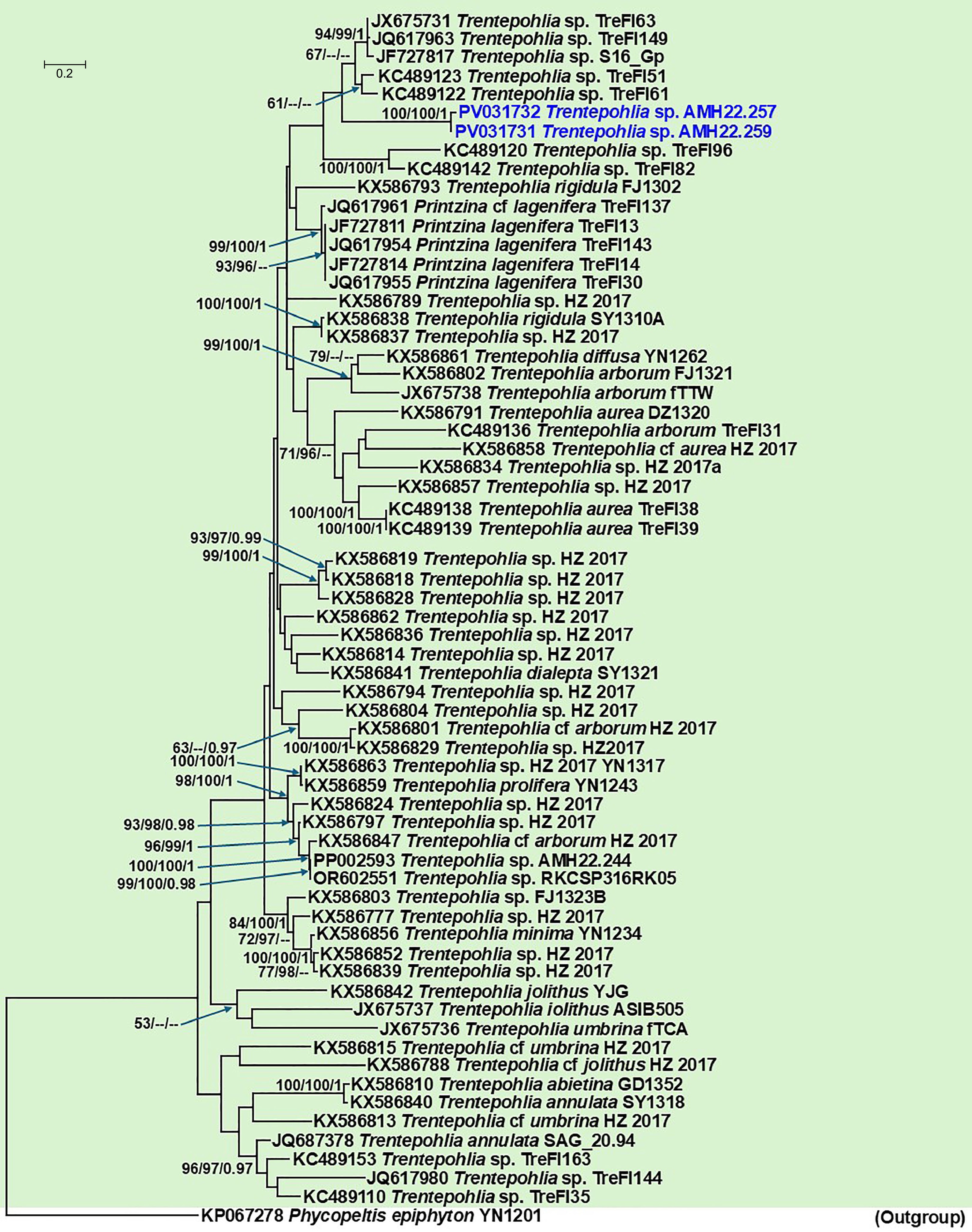Phylogenetic tree generated from Maximum Likelihood (ML) analyses based on the combined ITS data for the genus Trentepohlia (Trentepohliaceae), and allied Printzina species. Node support from 1,000 non-parametric bootstraps for RAxML (R-BS), IQ-TREE (UFboot-BS), and posterior probability (PP) from MrBayes are shown at the nodes (R-BS ≥ 70%/Ufboot-BS ≥ 95%/PP ≥ 0.95). Low support values are not denoted. The tree is rooted with Phycopeltis epiphyton voucher YN1201. The sequence generated for Trentepohlia sp. in this study is indicated in blue.