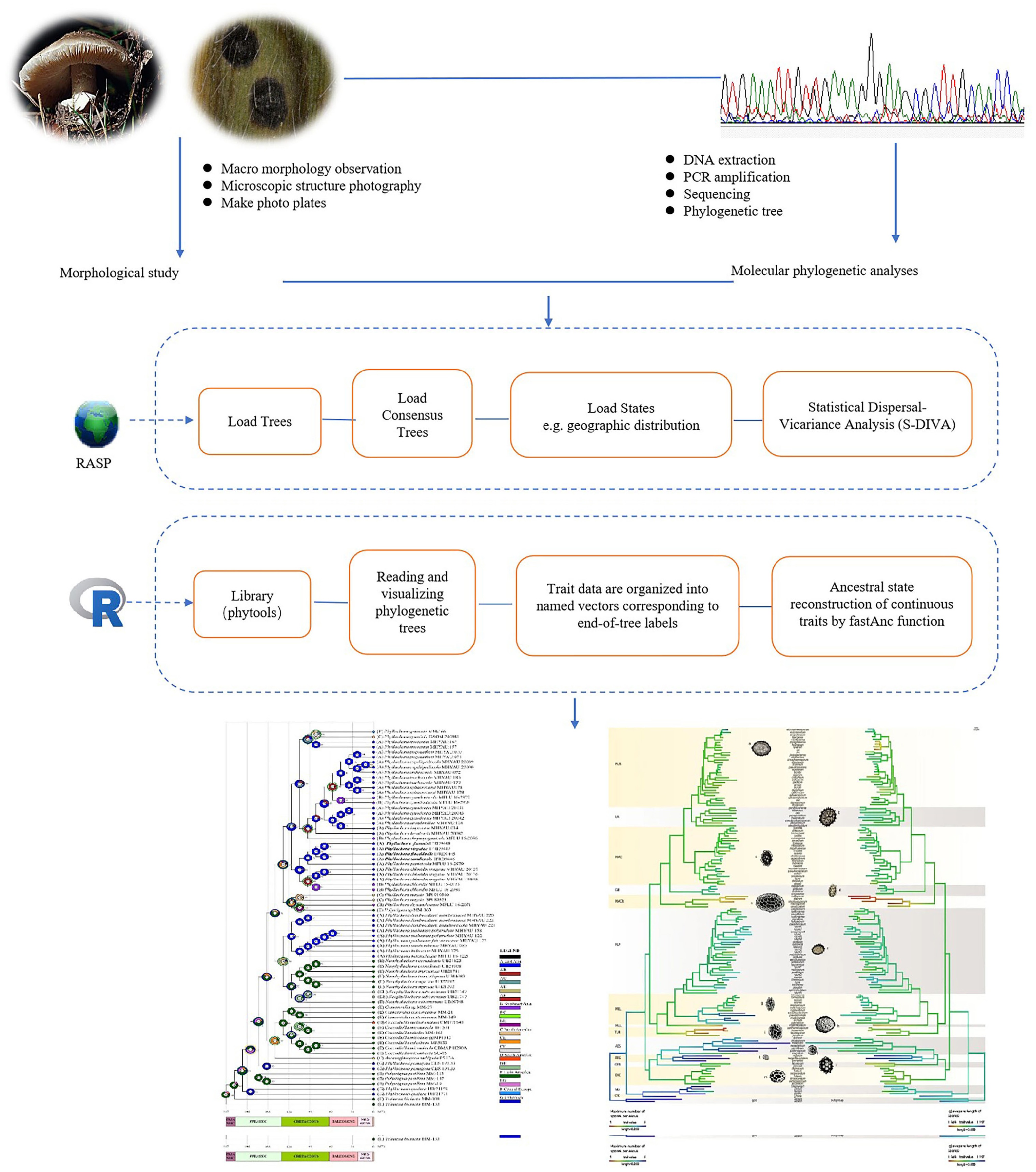 Abstract: Clarifying the phylogenetic relationships of fungi by integrating genetic evolution and morphological characteristics is central to modern fungal taxonomy. Ancestral state reconstruction (ASR) is a key phylogenetic tool that applies statistical models to infer the evolution and timing of ancestral morphological traits using genetic data. By mapping traits onto phylogenies, ASR helps clarify the evolutionary transitions and origin of traits. This paper reviews the theoretical foundations of ASR and surveys commonly used methods and software in fungal systematics. It also highlights the practical applications of ASR in fungal taxonomy, particularly in reconstructing morphological evolution and testing molecular phylogenetic hypotheses. The findings highlight ASR as an indispensable tool for analyzing fungal phylogenies, addressing taxonomic controversies, and supporting evolutionary research. This review presents relevant insights into the application of ASR in fungal classification, providing methodological support, and a scientific basis for the classification and evolutionary studies of important fungal taxa. The future direction of the field is to integrate multi-omics, innovative algorithms, and ecological function inference to accurately analyze key events in evolutionary innovation.
