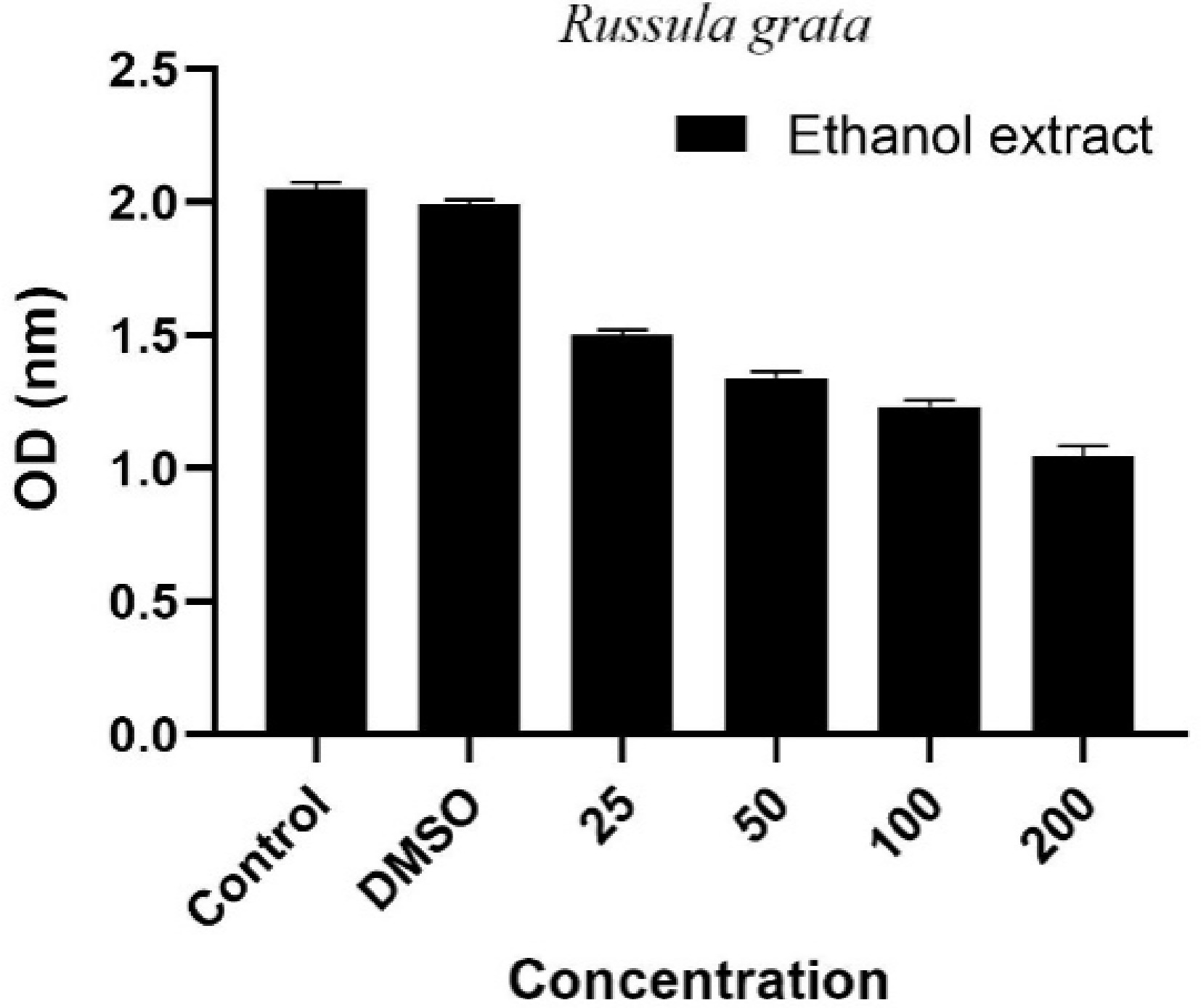Dose-dependent antiproliferative effect of Russula grata ethanol extract on A549 lung cancer cells. Control refers to cells maintained in medium without any chemical treatment. DMSO represents the vehicle control group, treated with dimethyl sulfoxide (DMSO) only. Extract-treated groups were exposed to Russula grata ethanol extract at concentrations of 25, 50, 100, and 200 μg/mL.