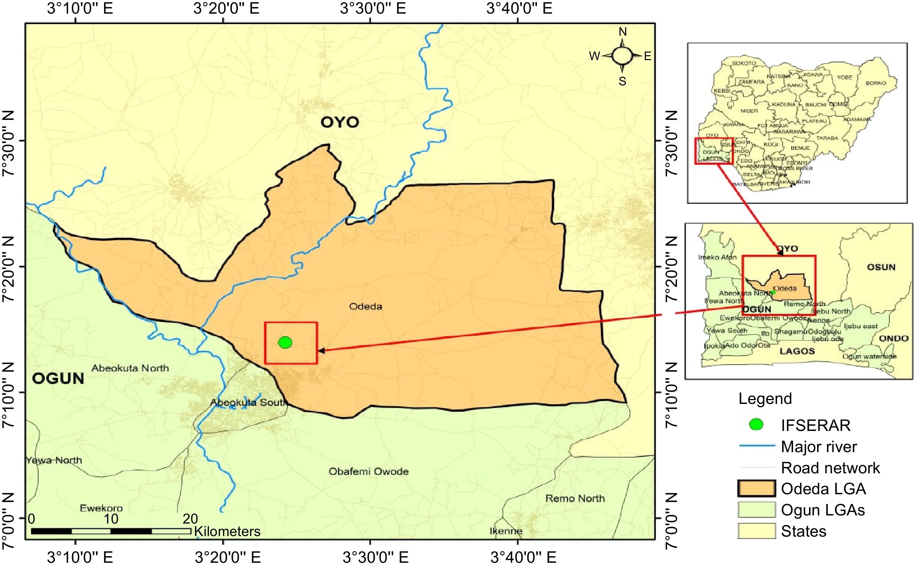 • The study was conducted at the Organic Research Plots of the Institute of Food Security, Environmental Resources and Agricultural Research (IFSERAR) of the Federal University of Agriculture, Abeokuta (Nigeria). The farm is located within (7°13'51.17'' N and 7°13'53.16" N and longitudes 3°23'49.12" E and 3°23'51.86" E, at an altitude of 131.5 m above sea level). Figure 1 shows a map of the project area.