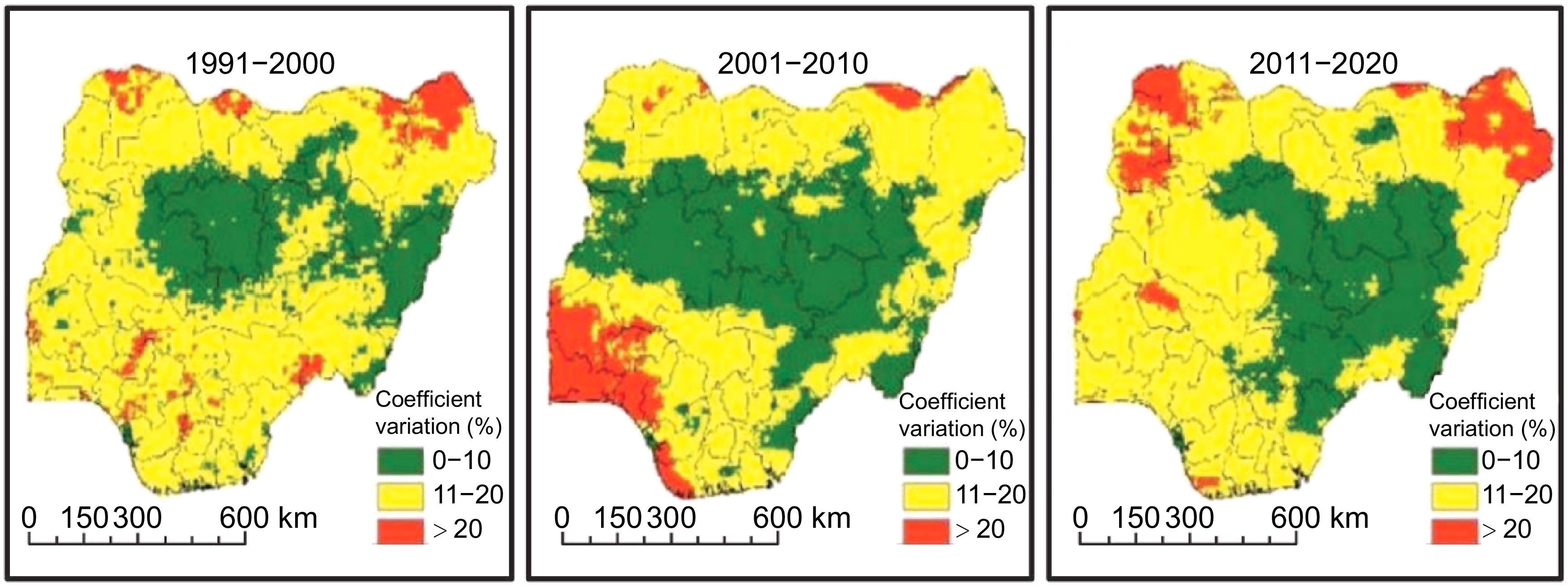 The coefficient of variation of rainfall during the growing season in Nigeria for three decades.