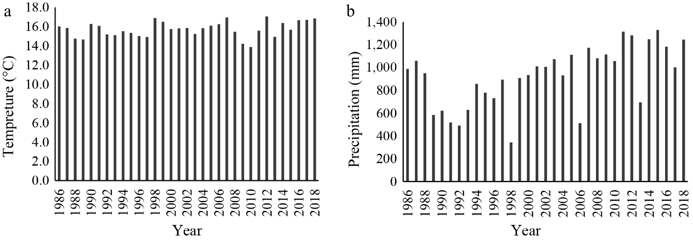 (a) Annual temperatures, and (b) precipitation during 1986–2018 at Jackson, TN, USA.