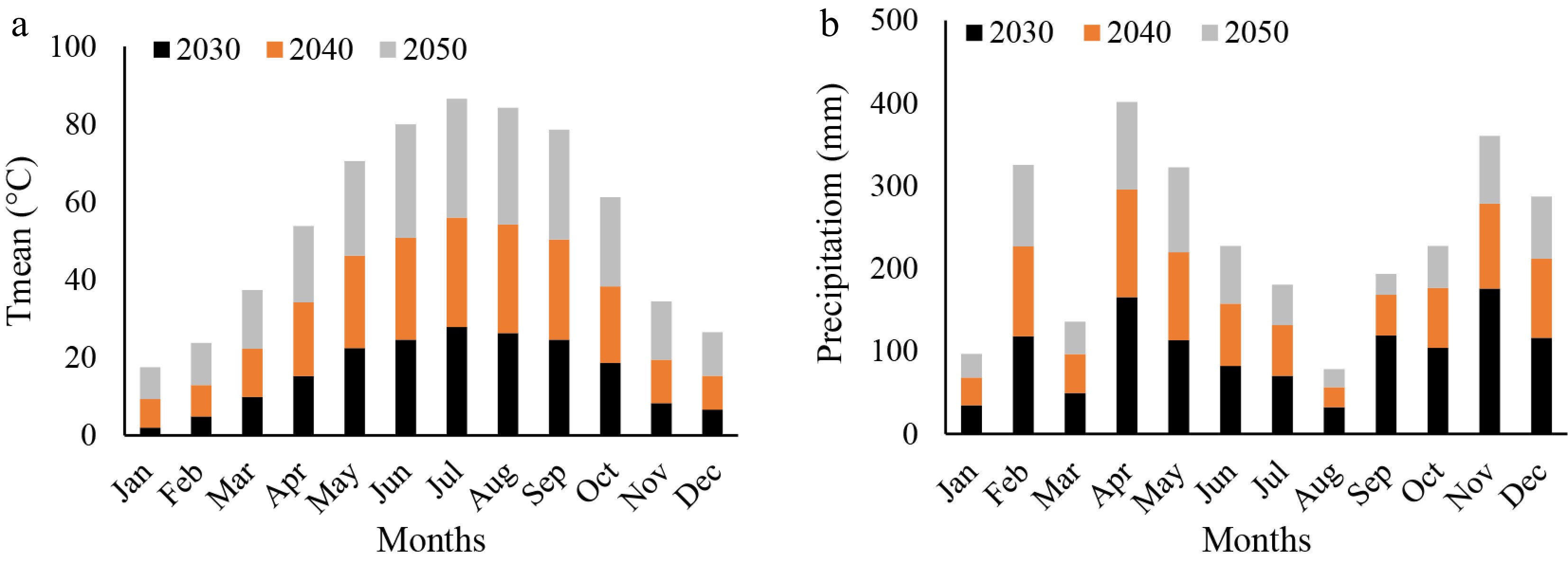 (a) Monthly average temperature, and (b) precipitation during 2030, 2040, and 2050 in Jackson, TN, USA.