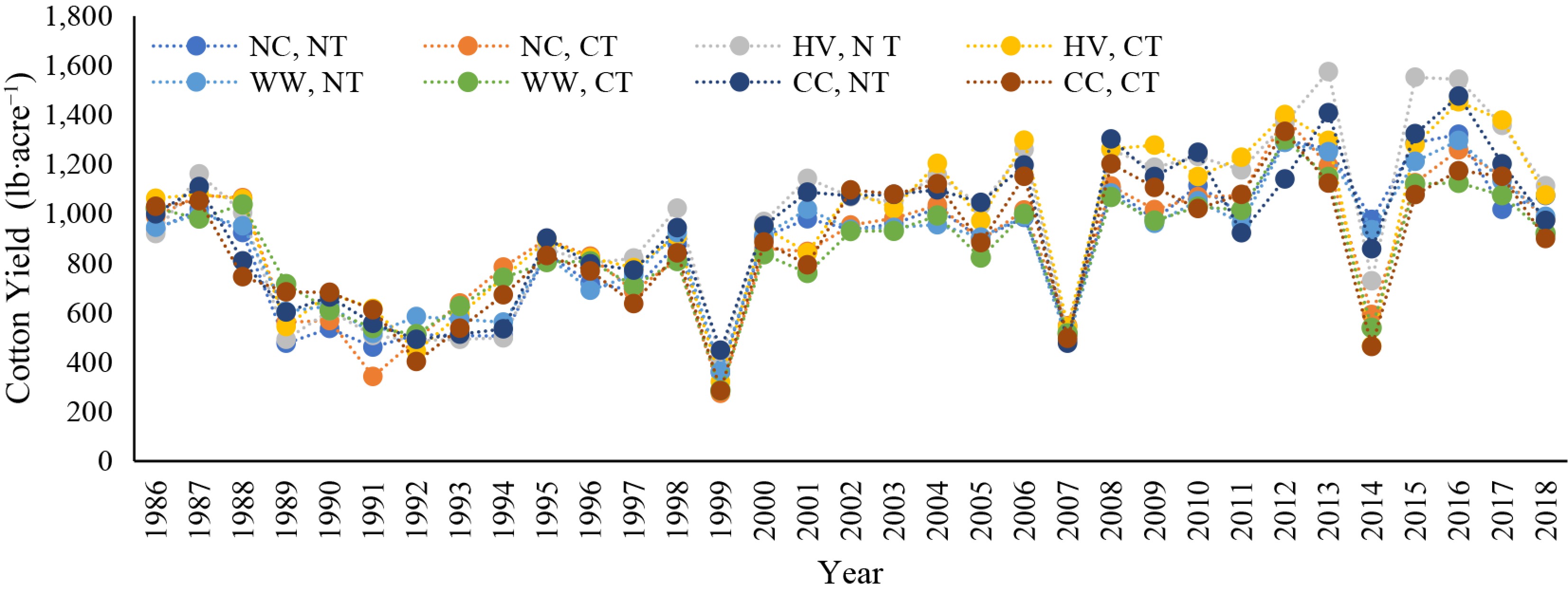 • Long-term yield trends were analyzed to assess the effect of cover cropping and tillage practices on cotton productivity over 33 years (1986–2018). The data provide insight into the cumulative impact of soil management strategies under historical climate variability and evolving agronomic conditions (Fig. 3).
