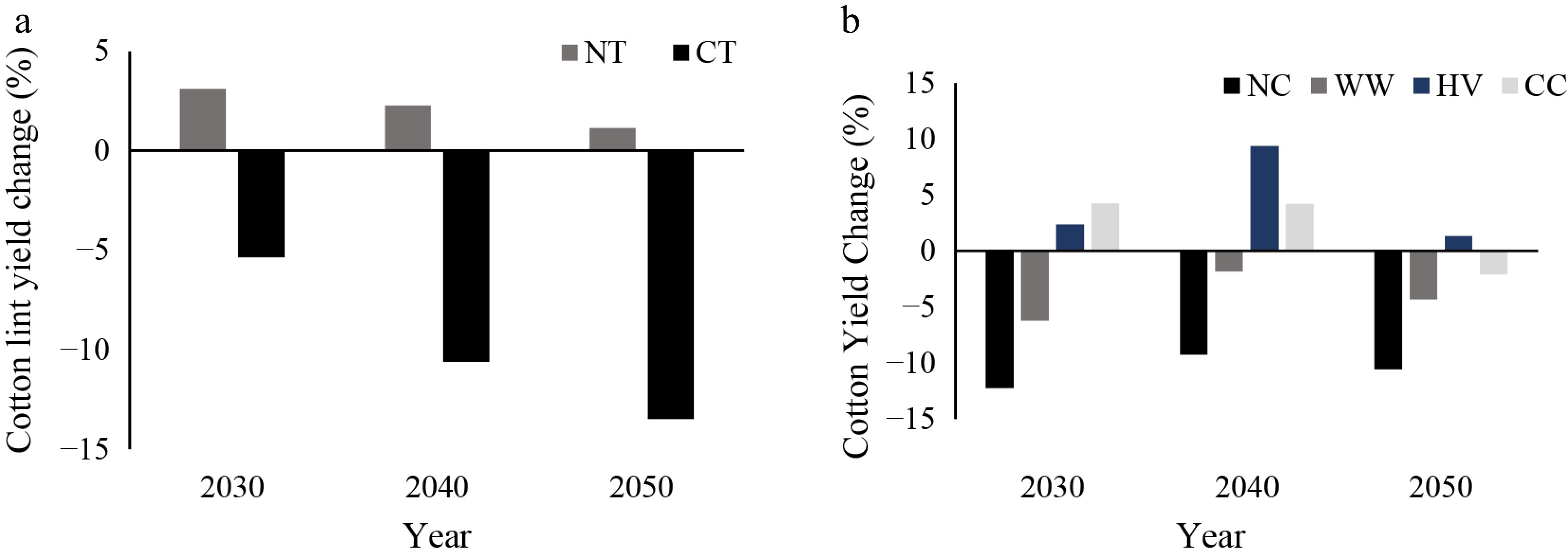 (a) Simulated changes in cotton lint yield across tillage practices, and (b) cover crop treatments in 2030, 2040, and 2050 under projected climate conditions.