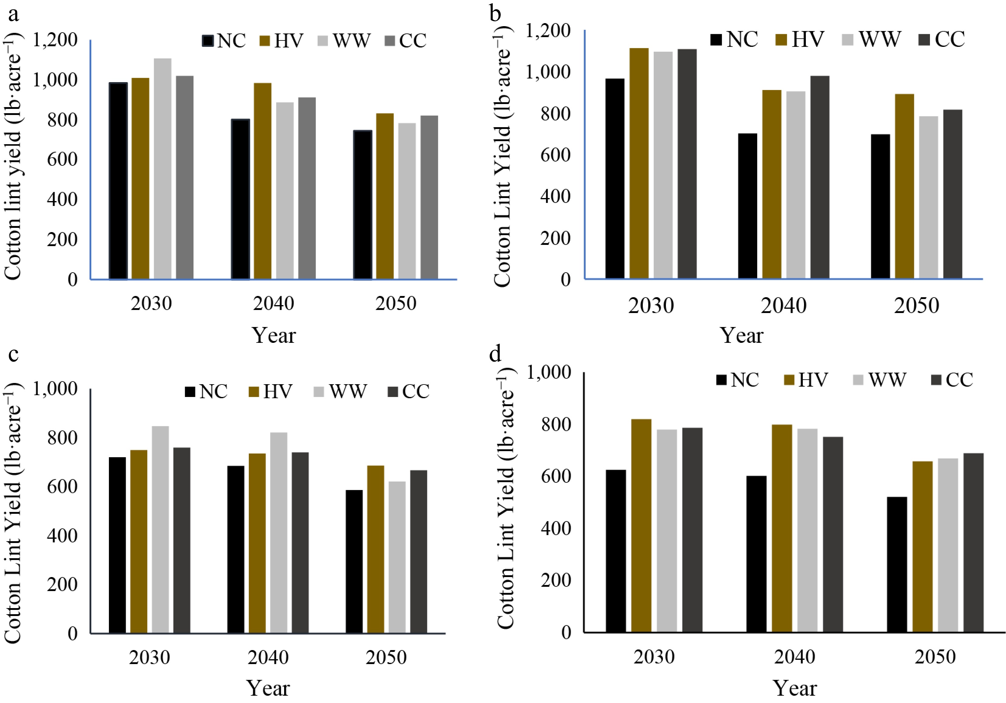 Comparison of cotton lint yield under (b), (d) conventional, and (a), (c) no-tillage systems with different cover crops (CC, NC, WW, HV) under (a), (b) RCP 4.5, and (c), (d) RCP 8.5 climate scenarios.