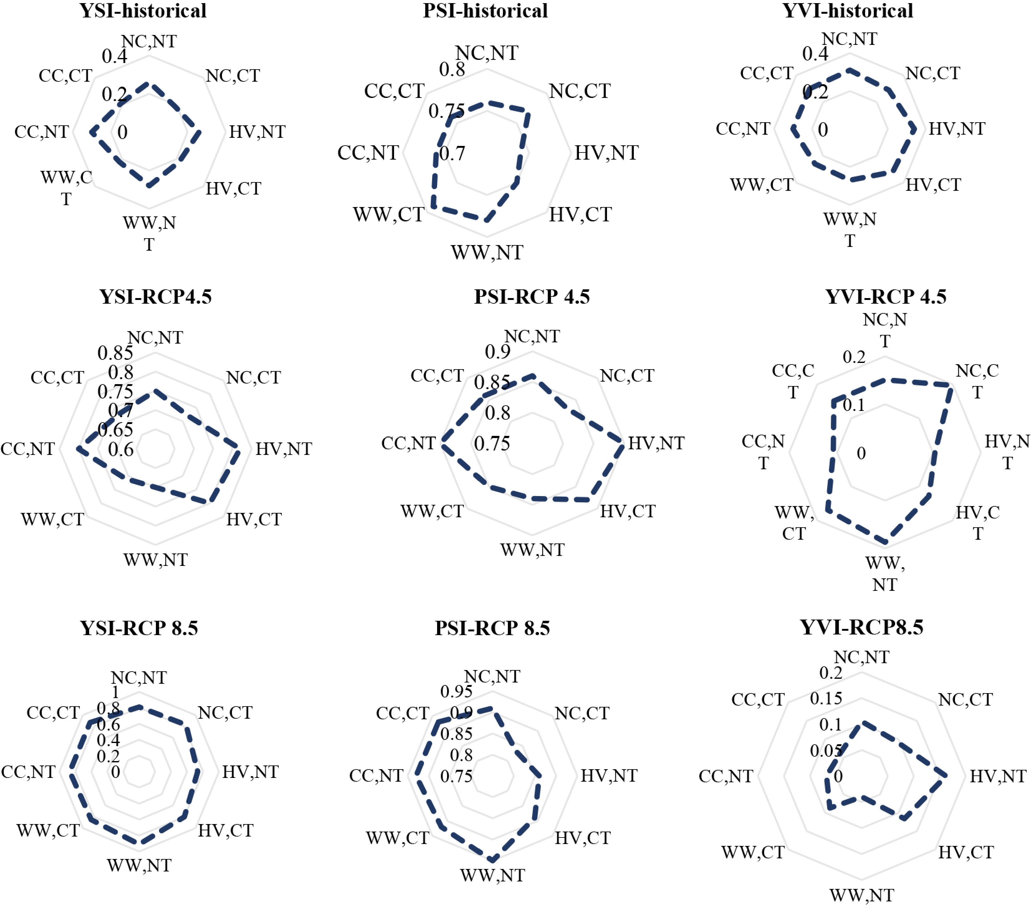 • Under the moderate emission scenario (RCP 4.5), overall performance improved relative to historical conditions. YSI values increased significantly, with HV–NT and CC–NT both reaching 0.82 and 0.80, respectively, compared to only 0.26 and 0.30 historically. The highest PSI values (0.90) were observed in HV–NT and CC–NT, reinforcing their enhanced stability under moderate warming. These treatments also showed relatively low YVI values (0.104 and 0.108, respectively), indicating reduced interannual variability (Fig. 6df).