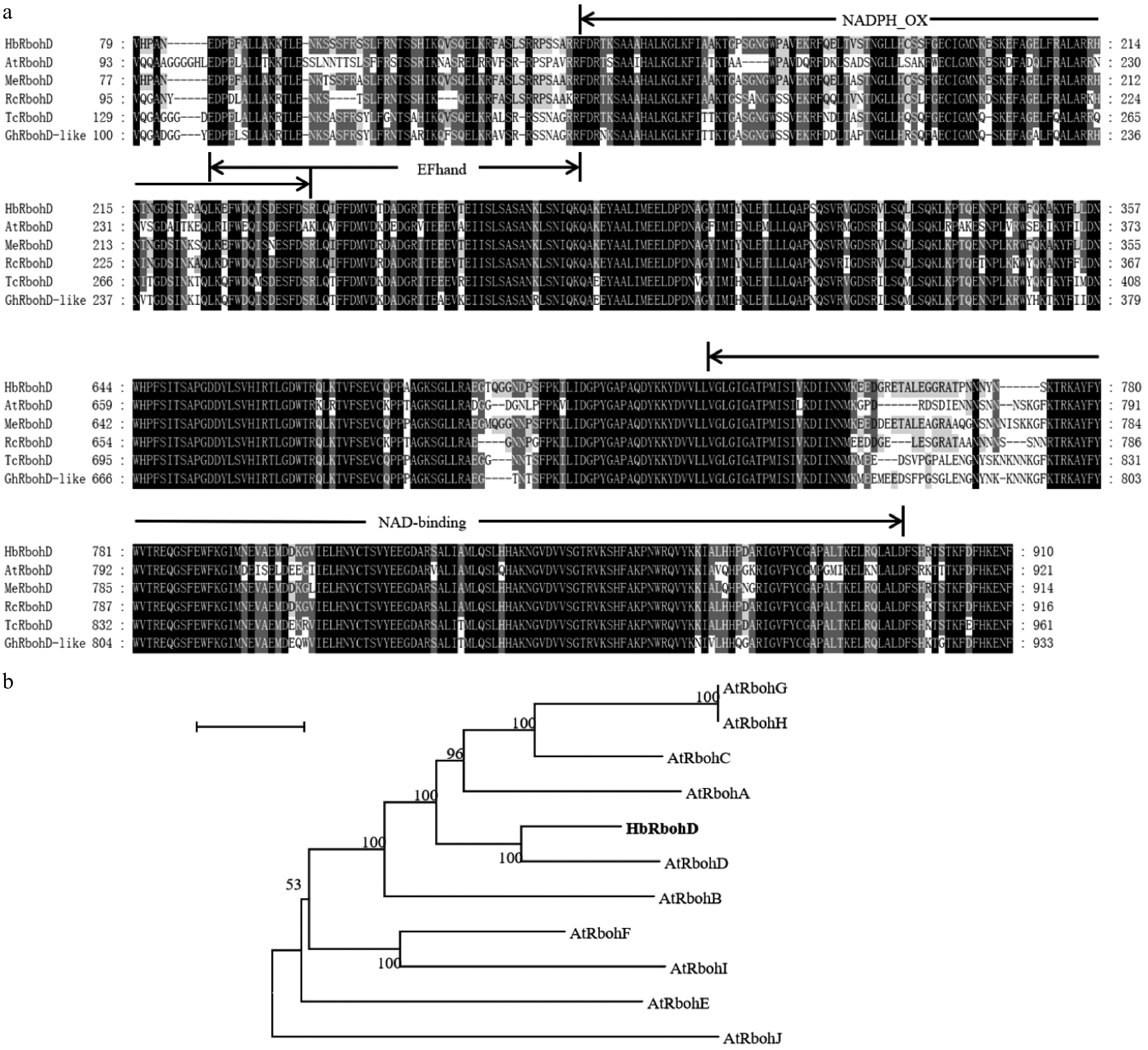 • The nucleotide sequence of Arabidopsis respiratory burst oxidase homolog D (AtRbohD) (AT5G47910) was used as a query to perform a BlastX search against the NCBI database to obtain the homolog of RbohD in rubber tree. Refseq No. XP_021679868.1 was selected as a candidate and named as HbRbohD. The full length CDS of HbRbohD was amplified by RT-PCR, and the sequence was verified by sequencing. The full-length CDS of HbRbohD was 2,733 bp, encoding a 910 amino acid polypeptide with a 102.5 kDa molecular weight. The amino acid alignment showed that HbRbohD, as well as the known RbohD from the other plants, contained NADPH_Ox, EF-hand, and NAD-binding conserved domains and had the highest homology with RbohD from Arabidopsis (Fig. 1a). All ten RBOH proteins from A. thaliana and HbRbohD were used to generate a Neighbour-joining tree (Fig. 1b). Phylogenetic tree analysis revealed that HbRbohD was clustered in the same branch as AtRbohD, suggesting that HbRbohD was the homolog of AtRbohD in rubber tree.
