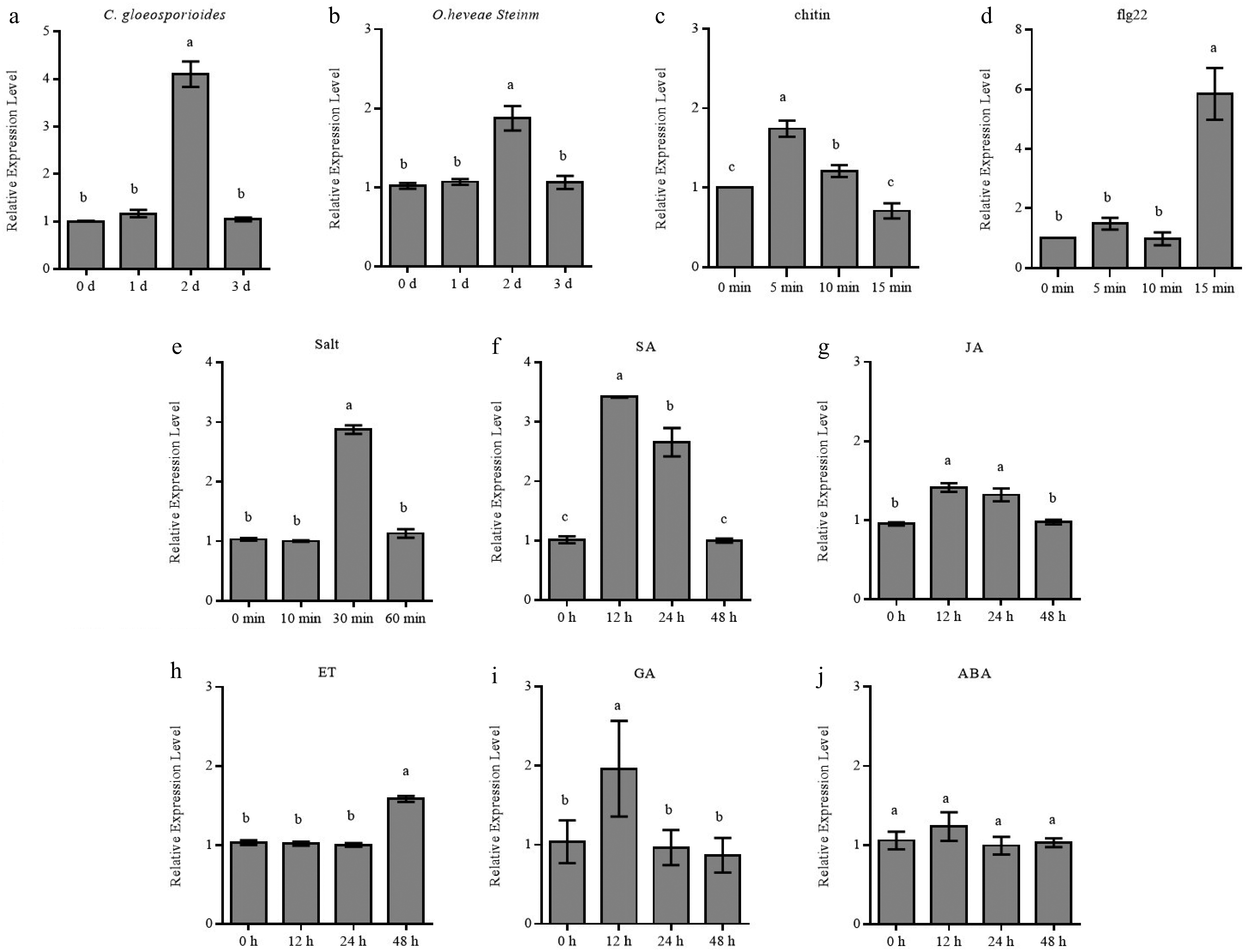 Expression patterns of HbRbohD in response to stresses and phytohormone treatments. The expressions of HbRbohD in rubber tree leaves inoculation with (a) C. gloeosporioides, and (b) O. heveae Steinm, in rubber tree mesophyll protoplasm treated with (c) chitin, and (d) flg22, in rubber tree suspension callus cultures treated with (e) salt, and treatment with various phytohormone, such as (f) SA, (g) JA, (h) ET, (i) GA, and (j) ABA were quantitatively assessed through qRT-PCR analysis, with transcript abundance being normalized against baseline measurements obtained at day 0 (control). The expression level was normalized using actin as housekeeping gene. Data are shown as the means ± SD from three independent experiments and the mean values assigned dissimilar superscript letters differ significantly (p < 0.05).