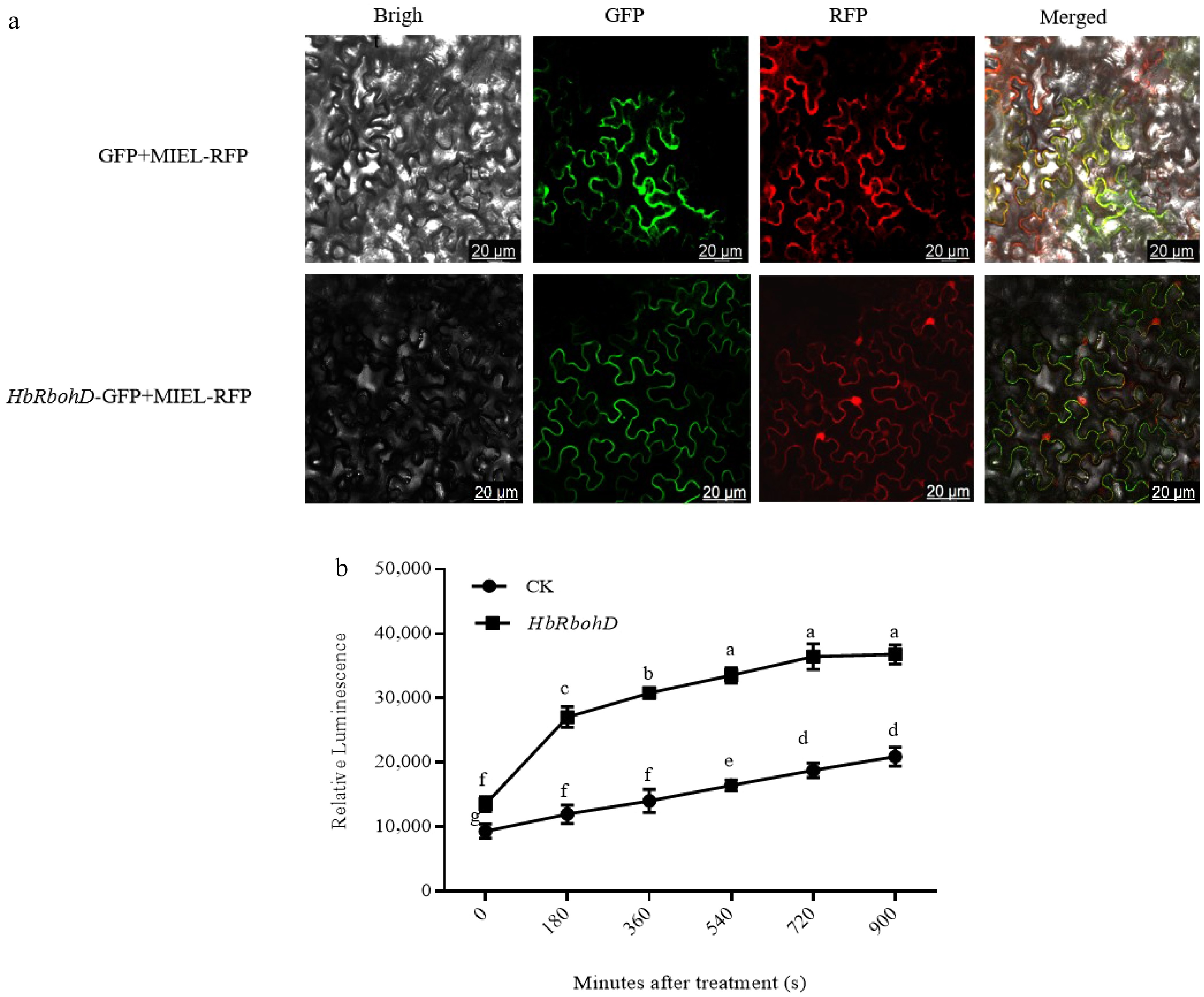 Subcellular localization of HbRbohD and the function of HbRbohD on ROS production. (a) Subcellular localization of HbRbohD. Tobacco leaves co-expressing GFP/MIEL-RFP and HbRbohD-GFP/MIEL-RFP were viewed with fluorescent microscope 24 h after infiltration (bar, 20 μm). (b) The function of HbRbohD on ROS production. The oxidative degree in protoplasts was detected by dichlorofluorescin diacetate (DCFH-DA) and the fluorescence intensity was measured every 3 min for 15 min. Data presented are the mean ± SD from three independent experiments and the mean values assigned dissimilar superscript letters differ significantly (p < 0.05).