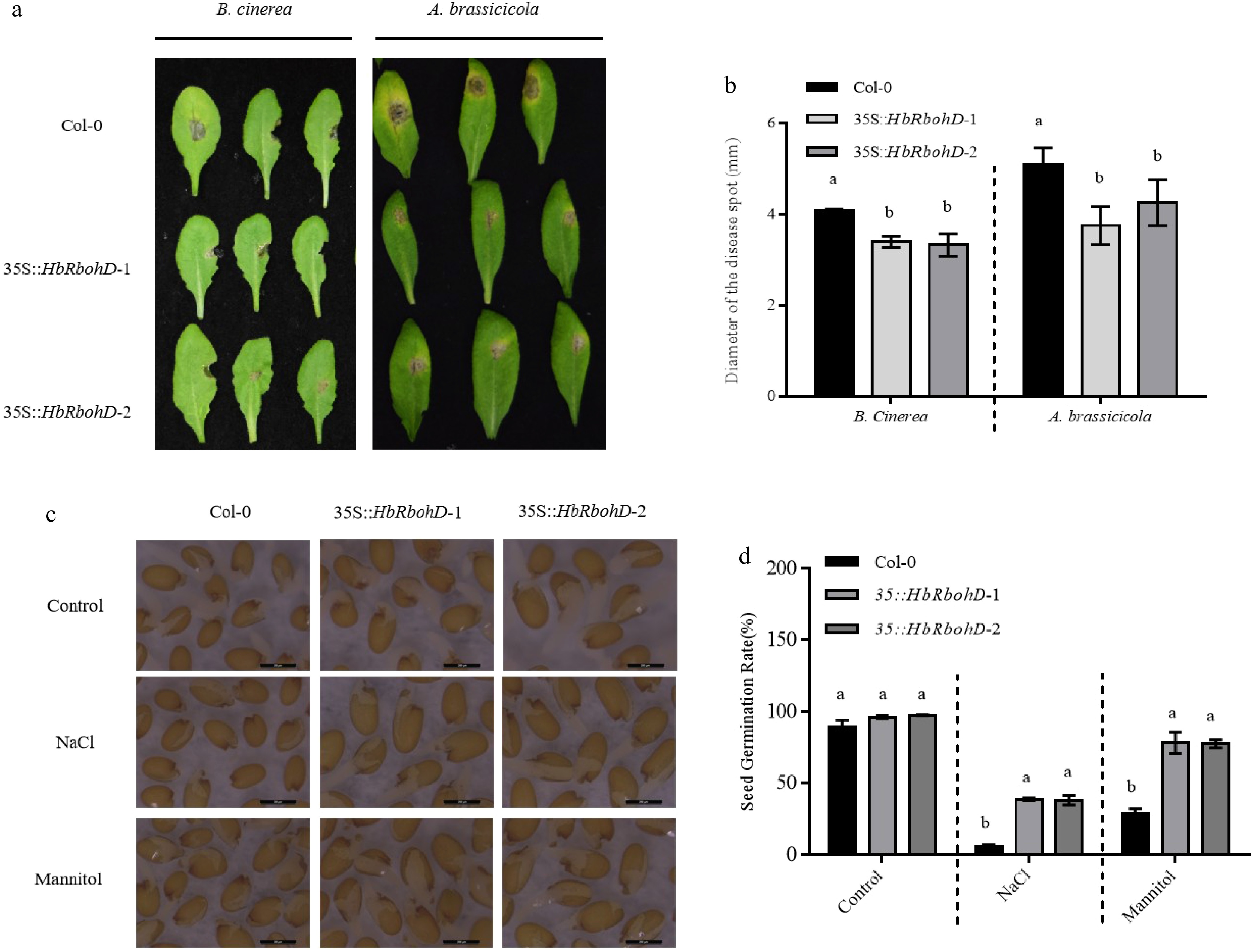 Disease and seed osmotic tolerance assay of Col-0 and 35S::HbRbohD. (a) Disease symptoms of A. thaliana Col-0 and 35S::HbRbohD to B. cinerea and A. brassicicola. (b) Statistical analysis of necrotic lesion in WT and 35S::HbRbohD. The symptoms observation and the lesion measure were performed at 3 d post inoculation with B. cinerea and A. brassicicola, respectively. (c) Seed germination of Col-0 and 35S::HbRbohD on ½ MS medium with exogenous NaCl treatment (150 mM) and mannitol treatment (200 mM). (d) The quantitative analysis of germination rates of Col-0 and 35S::HbRbohD on ½ MS medium with exogenous NaCl treatment (150 mM), and mannitol treatment (200 mM). Data presented was the mean ± SD from three independent experiments and the mean values assigned dissimilar superscript letters differ significantly (p < 0.05).