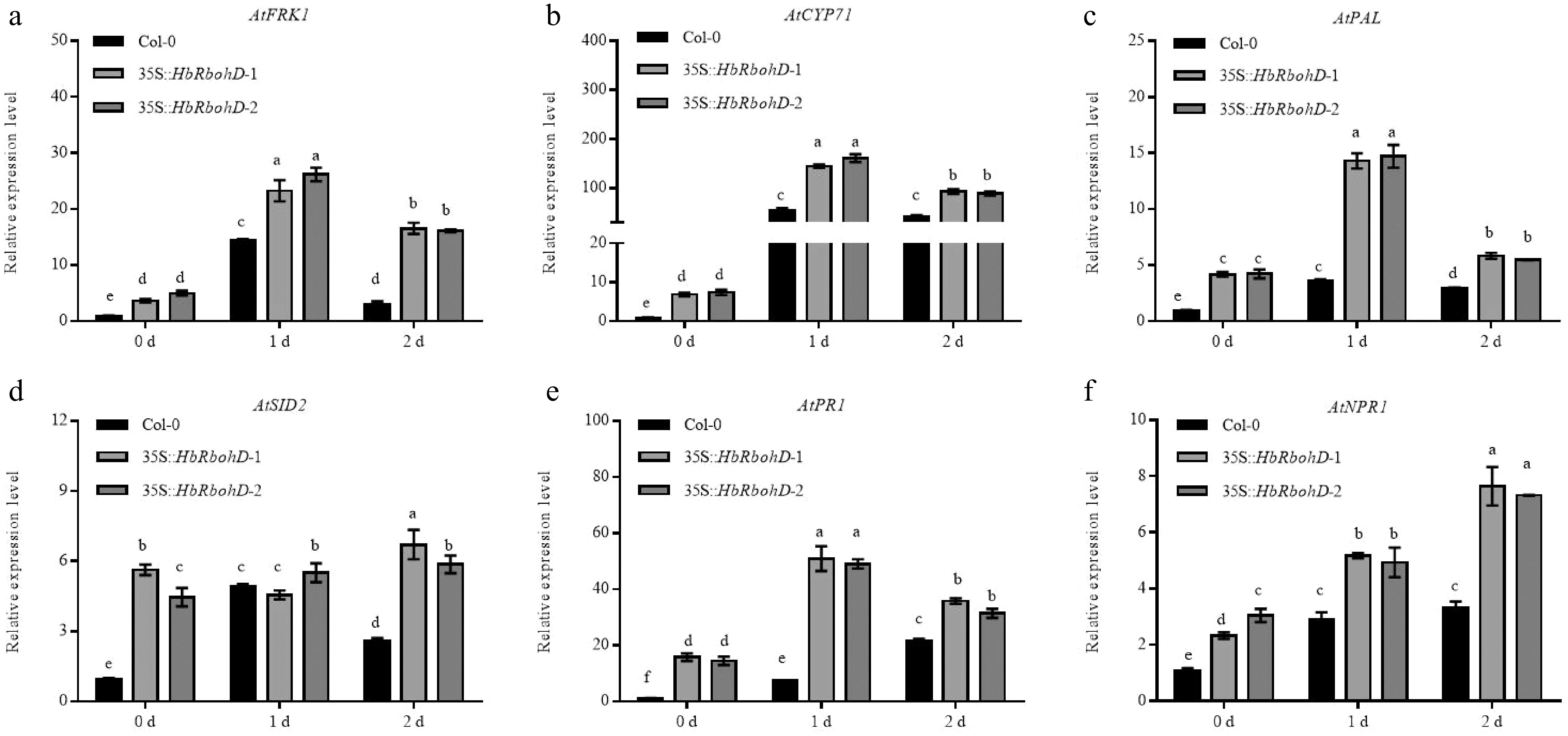 Relative expression assay of defense related genes in Col-0 and 35S::HbRbohD inoculated with B. cinerea. The expression of defense related genes, such as (a) AtFRK1, (b) AtCYP71, (c) AtPAL, (d) AtSID2, (e) AtPR1, and (f) AtNPR1, were analyzed by qRT-PCR in Col-0 and 35S::HbRbohD inoculated with B. cinerea. Data are shown as the means ± SD from three independent experiments. Different letters above columns indicate a significant difference (p < 0.05).