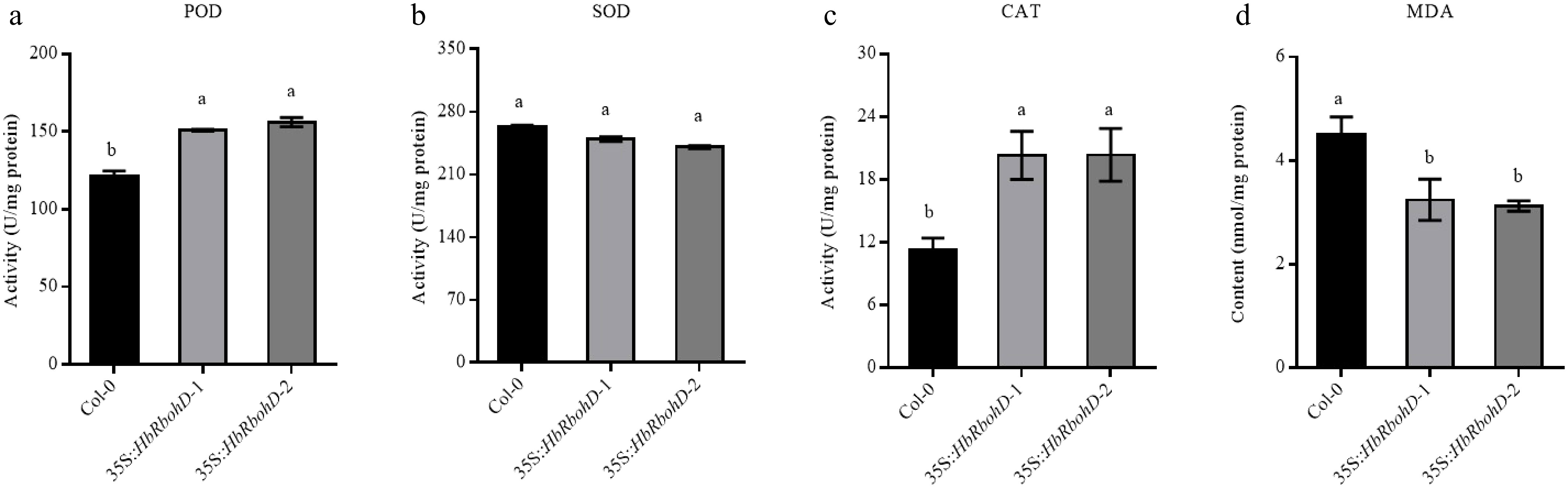 Activity of antioxidant enzymes and MDA content in Col-0 and 35S::HbRbohD. The key antioxidant enzyme activities of (a) POD, (b) SOD, (c) CAT, and the content of (d) MDA were analyzed in Col-0 and 35S::HbRbohD, respectively. Data presented was the mean ± SD from three independent experiments and the mean values assigned dissimilar superscript letters differ significantly (p < 0.05).