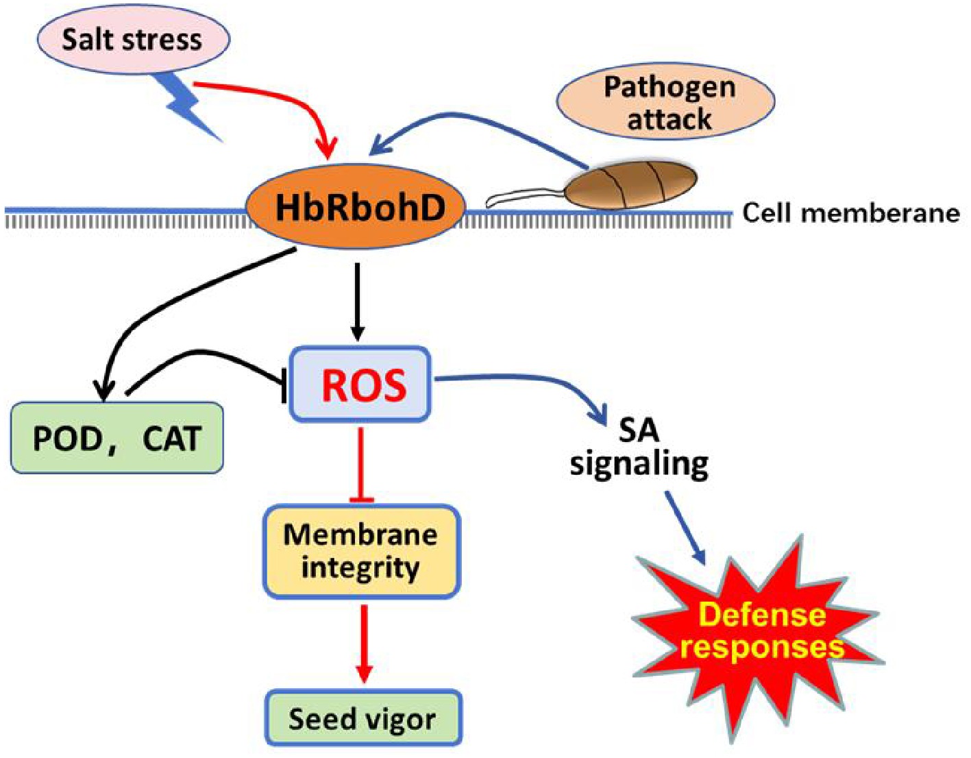 Proposed model of respiratory burst oxidase homolog D of rubber tree (HbRbohD) signaling in response to biotic and abiotic stressed. HbRbohD regulates ROS homeostasis through antioxidant enzymes to regulate cell membrane integrity and seed vigor under salinity stress conditions (red arrows). HbRbohD also regulates the expression of defense-related genes,especial, enabling plants to respond to pathogen attack (blue arrows). The black arrows represent the common pathway shared by salt stress and pathogen attack.