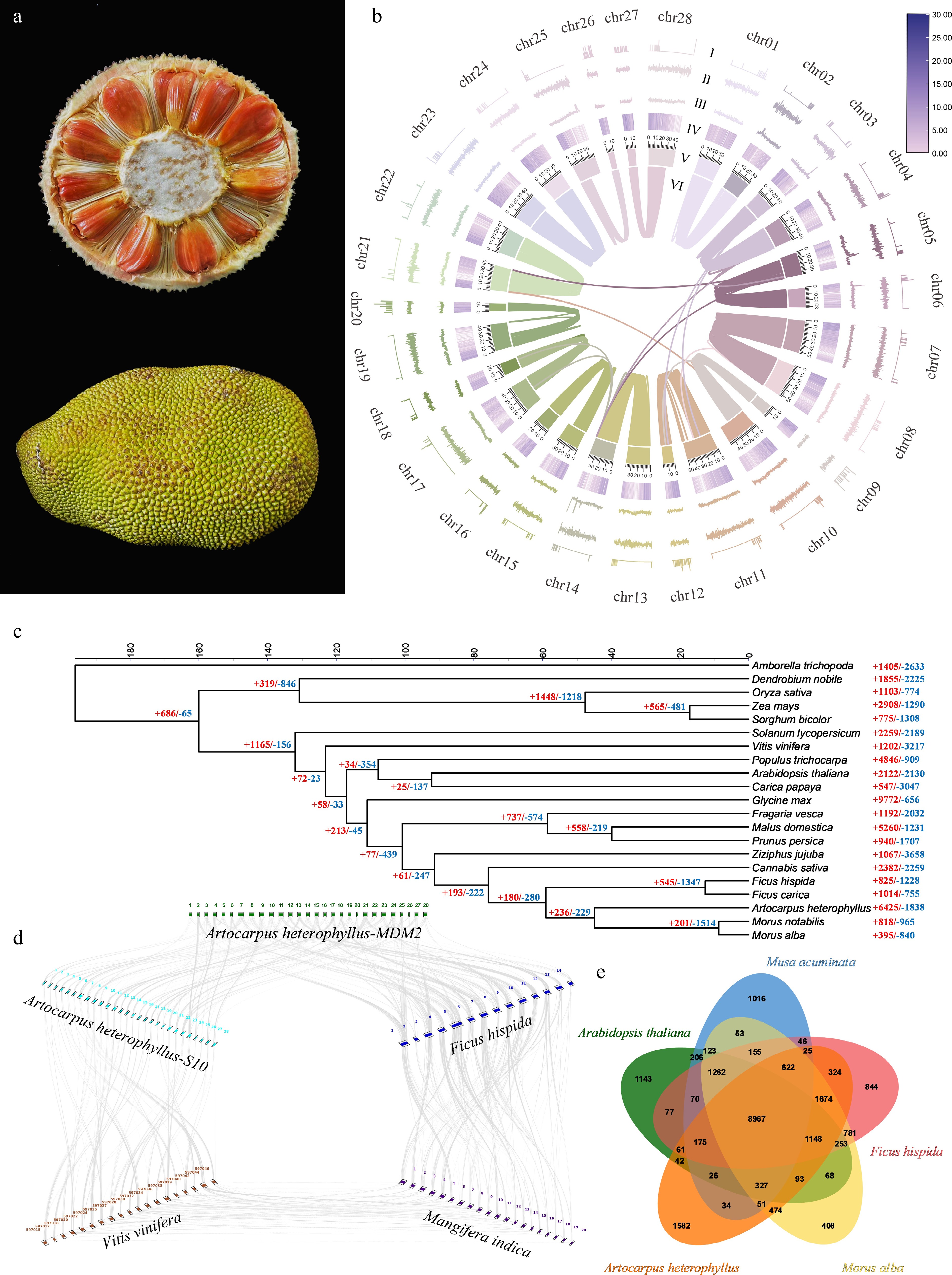 (a) Morphological features of A. heterophyllus-MDM2. (b) Circos diagram of the A. heterophyllus-MDM2 genome features. (I: N [unknown bases]. II: GC skew. III: GC content. IV: gene density distribution. V: chromosome length. VI: intra-genomic chromosomal synteny among chromosomes of A. heterophyllus-MDM2 genome). (c) Phylogenetic tree and divergence time estimation of A. heterophyllus and its related species. (d) Genome collinearity analysis among A. heterophyllus-MDM2, A. heterophyllus-S10, M. alba, F. hispida, and M. indica; syntenic blocks are highlighted with grey lines connecting different chromosomes, and numbers around the rectangles indicate the chromosome IDs of each genome. (e) Venn diagram showing the shared and unique gene sets among the studied genomes.