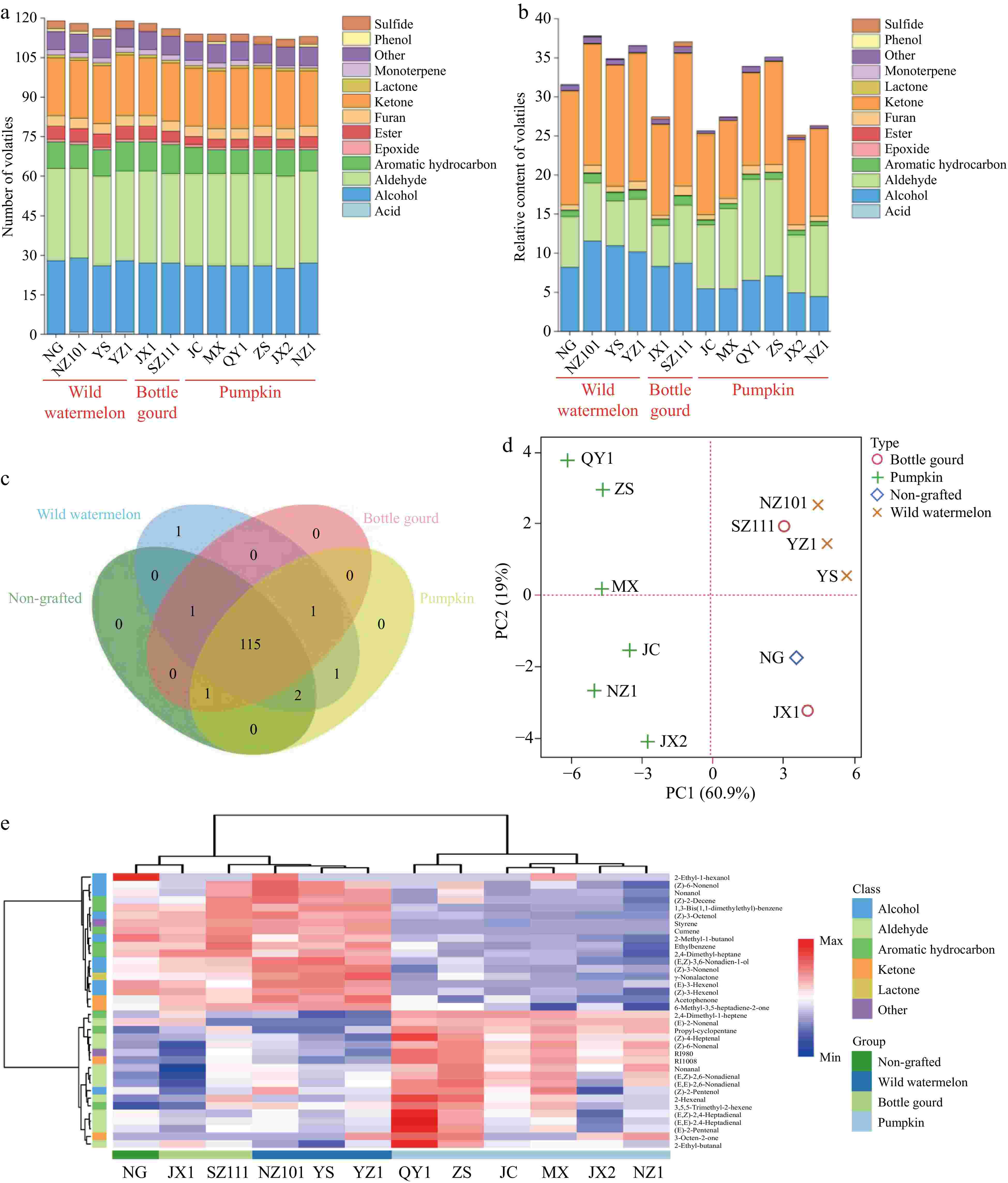Multivariate statistical analysis of volatile profiles for 'Ningnongke huadai' watermelon grafted onto different rootstocks. (a) Number, and (b) relative content of volatile compounds in each chemical class. (c) Venn diagram analysis of volatile compounds. (d) PCA score plot of volatile compounds that were identified as differentially accumulated among watermelon samples. (e) HCA of volatile compounds that were identified as differentially accumulated among watermelon samples. Each column in the figure corresponds to a sample, and each row to a volatile compound. The color coding indicates the relative content of volatile compounds in the respective sample groups. On the left, the dendrogram illustrates the clustering of volatile compounds, whereas the top dendrogram shows the clustering of samples, with sample names listed below.