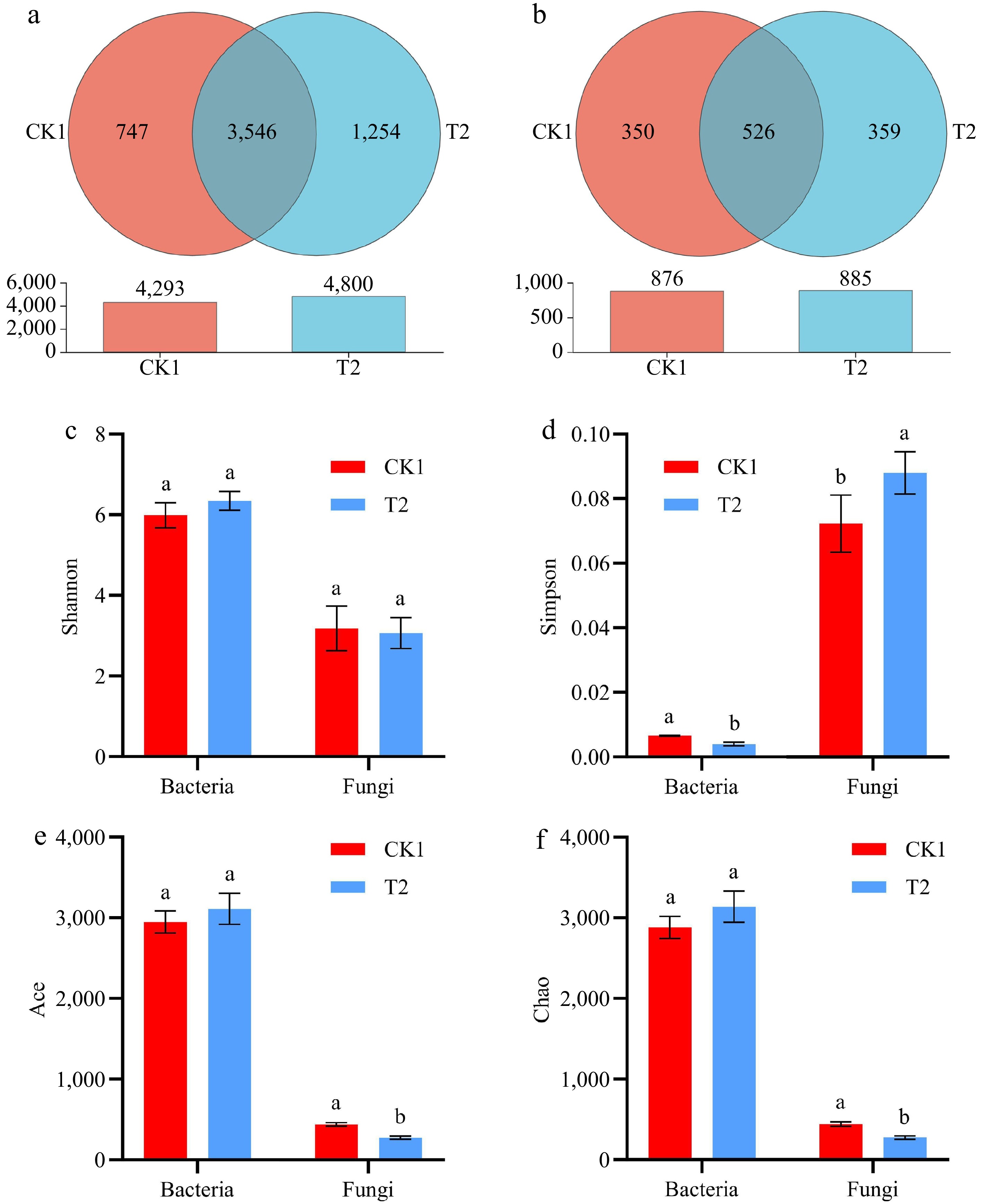 Microbial diversity was assessed based on operational taxonomic units (OTUs). Venn analysis revealed that CK1 and T2 collectively contained 9,093 bacterial and 1,761 fungal OTUs, with 1,097 and 1,613 unique OTUs, respectively. The abundance of bacterial OTUs was 67.9% higher in T2 than in CK1, and no significant differences were observed in fungal OTUs (Fig. 3a & b). Results of the rarefaction analysis demonstrated that the OTU sampling depth was sufficient for all generated libraries (Supplementary Fig. S2a & b). Additionally, Shannon-Wiener analysis indicated that the sequencing coverage adequately represented the microbial community within the sample, which supports the identifications made using the sequencing data (Supplementary Fig. S2c & d).