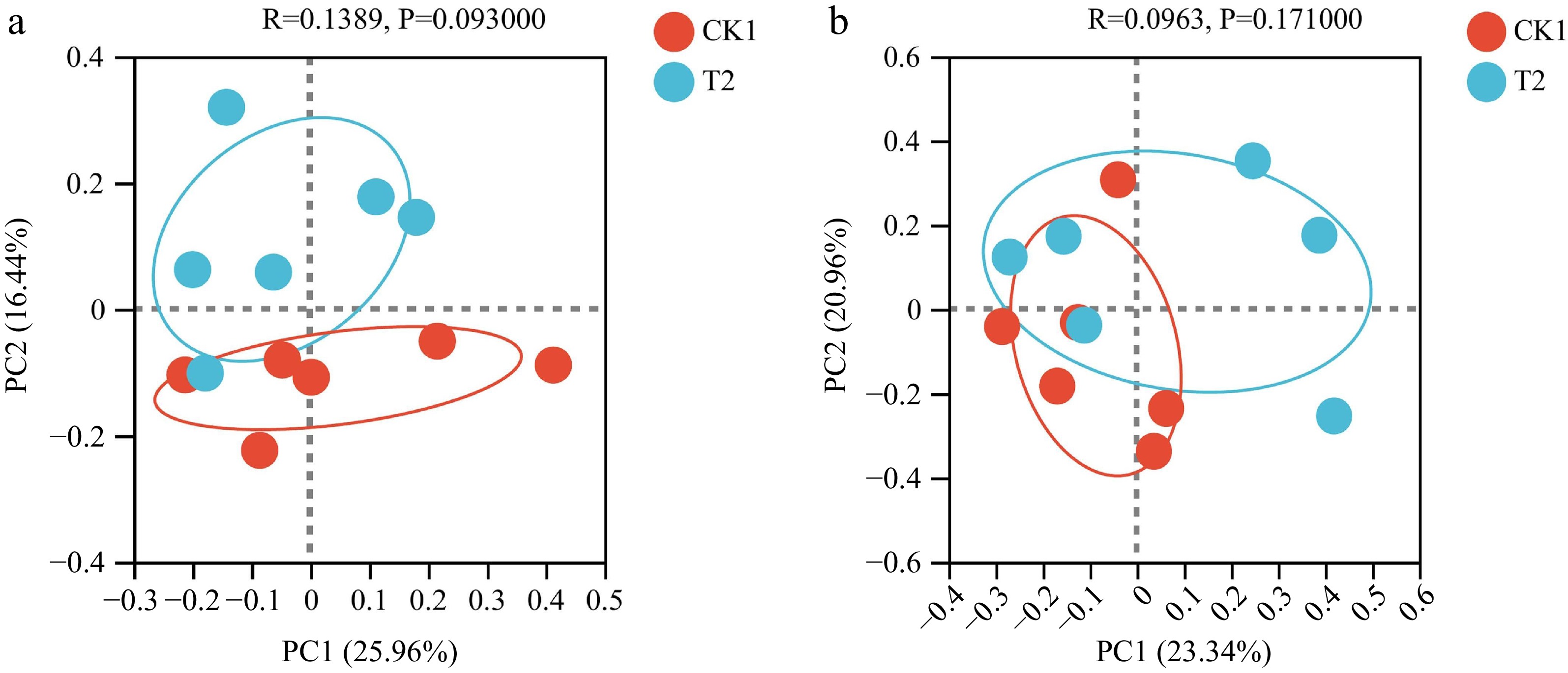 • Beta diversity analysis of soil bacterial and fungal communities were performed. Principal co-ordinates analysis (PCoA) was employed for the CK1 and T2 treatments (Fig. 4). The first principal component (PC1) and the second principal component (PC2) of the bacterial community structure accounted for 26.0% and 16.4% of the total variance, respectively. Similarly, PC1 and PC2 of the fungal community structure explained 23.3% and 21.0% of the total variance, respectively. No significant effects were observed regarding different drip irrigation frequencies on either bacterial or fungal community structures (p > 0.05).