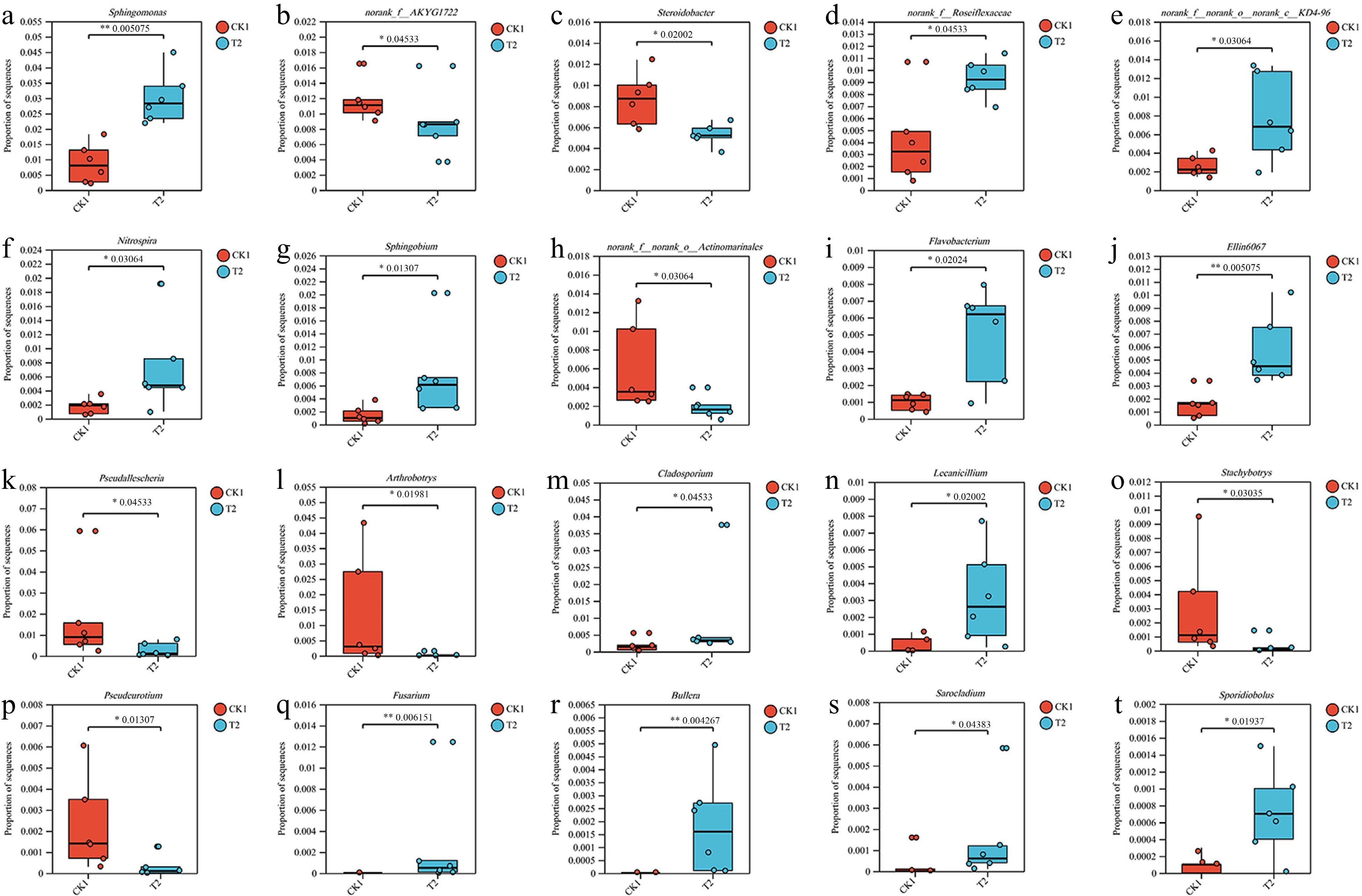 Wilcoxon rank-sum test chart of the (a)−(j) ten bacterial and (k)−(t) fungal genus with the highest abundance averages.
