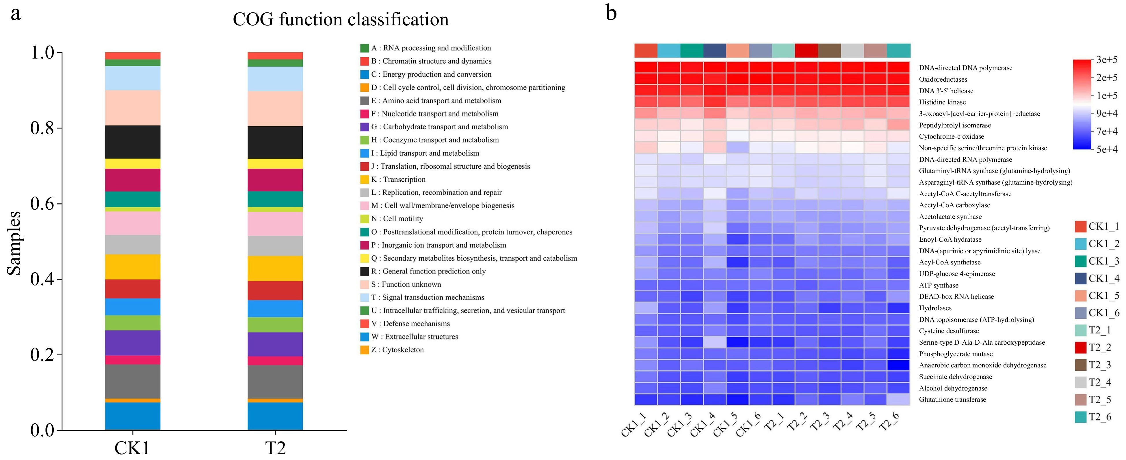 Clusters of Orthologous Groups (COG) functional classification of PICRUSt in (a) bacteria of CK1 and T2. The functional heatmap predicted by PICRUSt2 in (b) bacteria in CK1 and T2.
