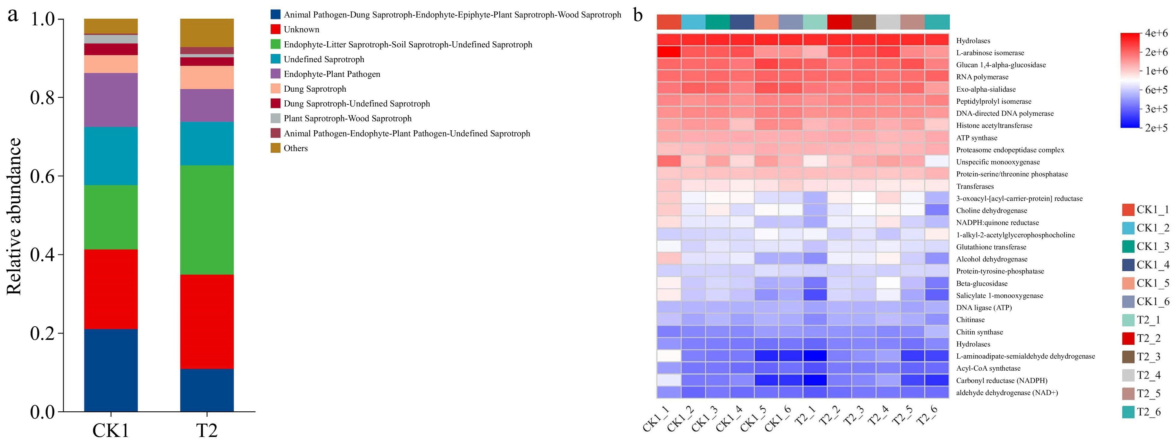 Taxonomic analysis of fungal communities by microecological guilds (FUNGuild) (a) of CK1 and T2. The functional heatmap predicted by PICRUSt2 in (b) fungi in CK1 and T2.