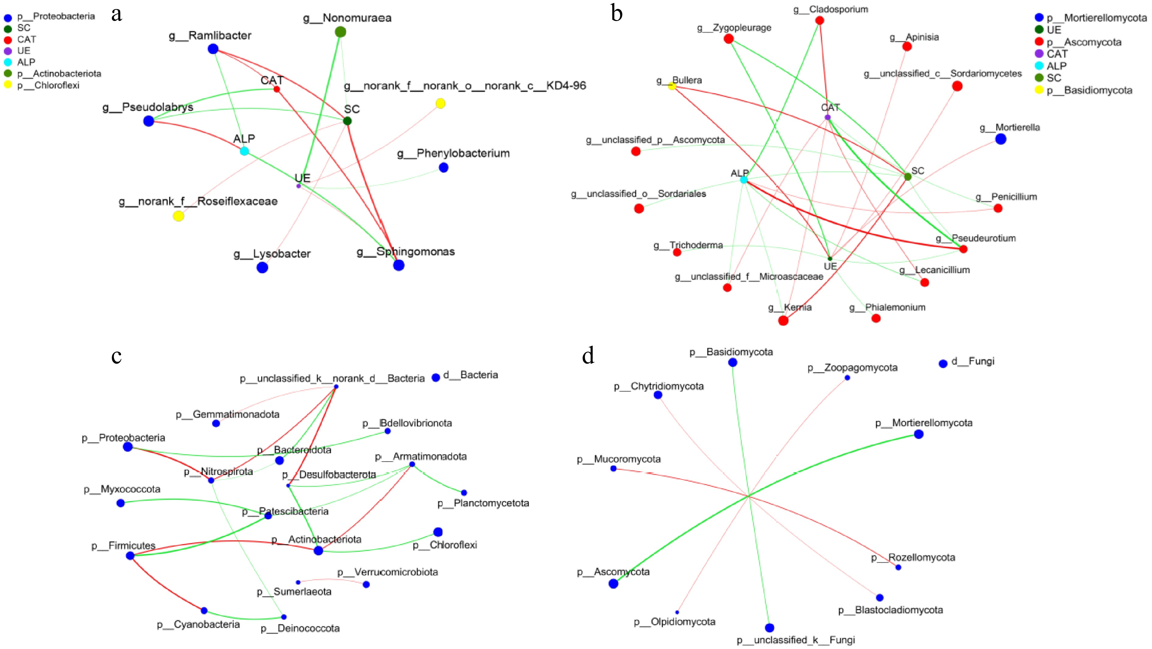 The correlations between different (a) bacterial and (b) fungal genera with soil enzyme activities. The microbial interactions in different (c) bacterial and (d) fungal phylum.