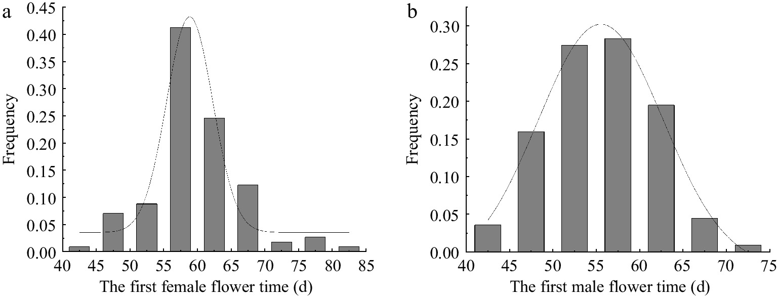 • In the F2 generation, the FFT among individual plants ranged from 49 to 90 d (Table 2). The distribution of FFT exhibited a kurtosis (SEK) of 3.186, indicating a marked peakedness, and a skewness (SES) of 1.171, which suggests a rightward skewed distribution. The coefficient of variation (CV) for FFT was computed at 13.166, reflecting a significant variability relative to the mean. Conversely, FMT ranged from 44 to 70 d, with a kurtosis of 0.521 and skewness of 0.413, indicative of a more symmetric distribution. The CV for FMT was slightly lower at 11.285, denoting moderate variation (Table 2).