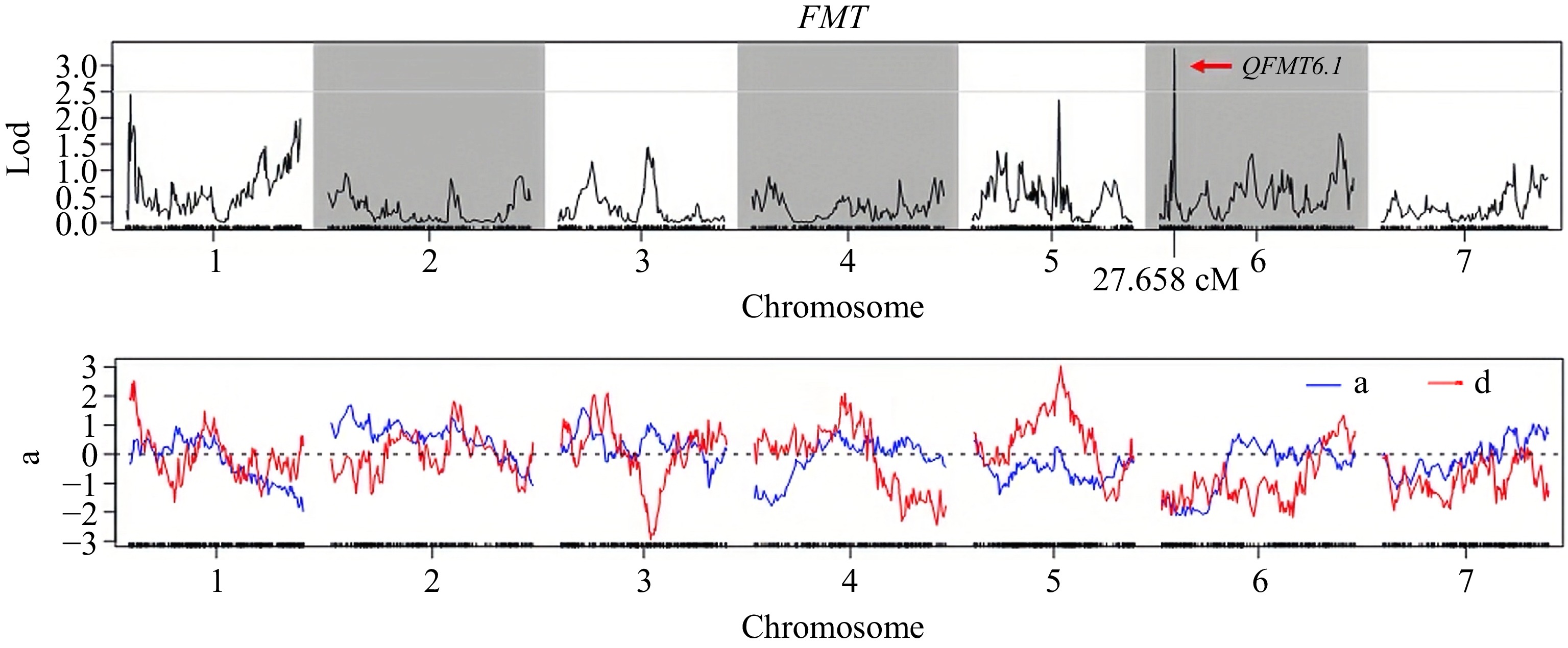 The LOD value distribution curve of QTL site of the FMT in the F2 population.
