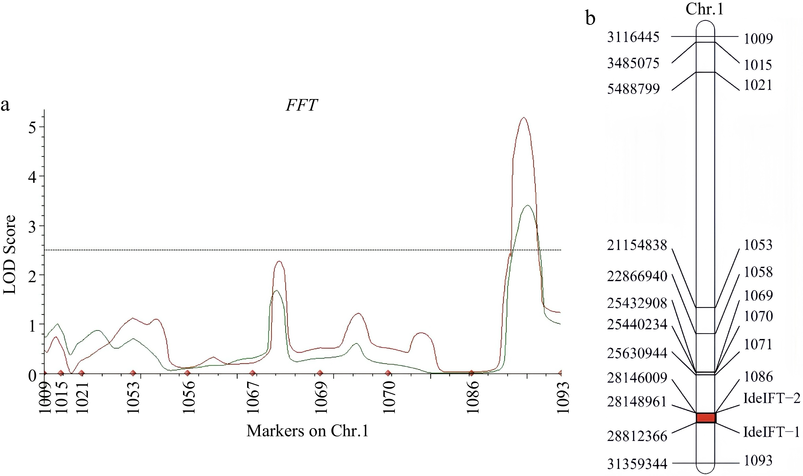 (a) Quantitative trait loci curve for cucumber FFT in F2:3 populations (green) and F2 (red). The filtering threshold was set as logarithm of the odds > 2.5. (b) Linkage map of Chr.1 the final FFT mapping interval in cucumber genome based on F2:3 family populations.
