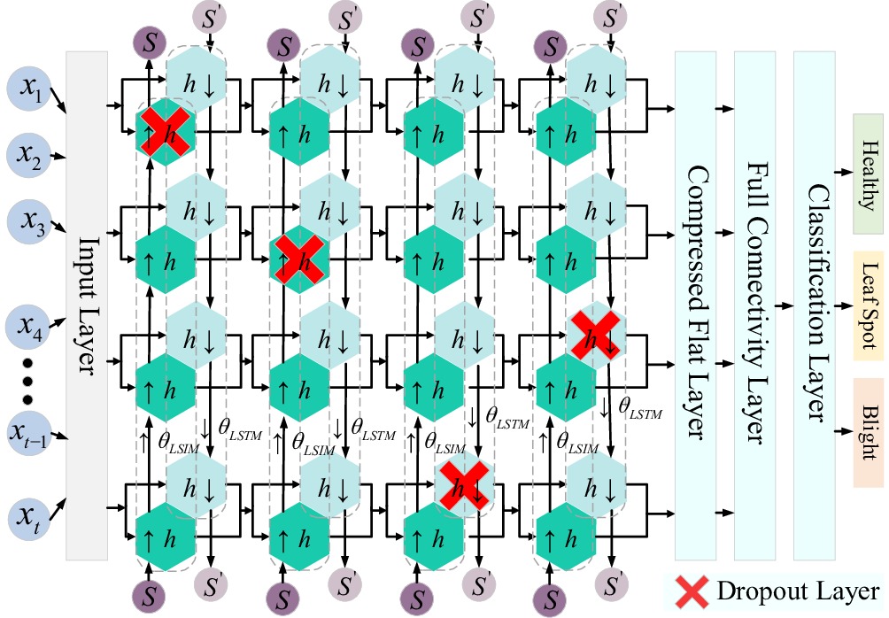 During forward time steps, the first LSTM layer processes the input data, utilizing its hidden states and memory units to effectively capture forward contextual information. Simultaneously, during backward time steps, the second LSTM layer processes the input data in reverse, capturing backward contextual information using its independent hidden states and memory units. These two directional information flows are seamlessly integrated to form a more comprehensive representation, enabling the network to better understand the context and structure of the entire sequence[29,30].