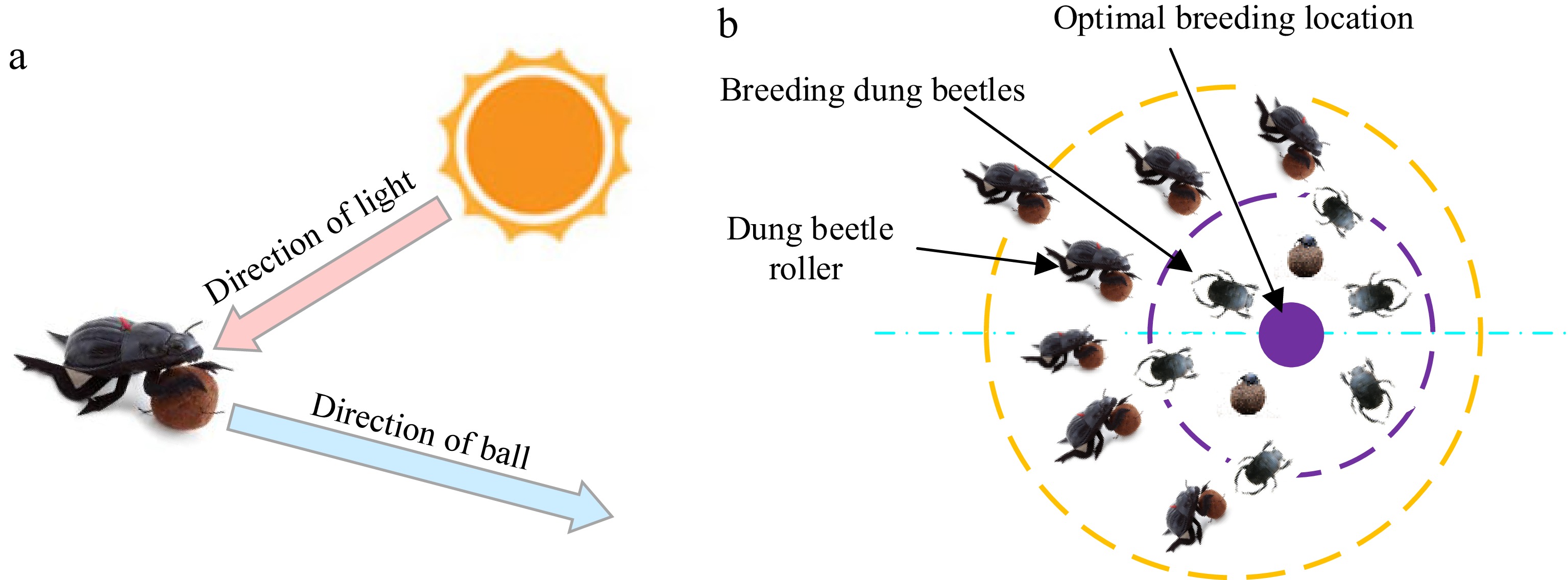 The Dung Beetle Optimizer Algorithm (DBO) was proposed by Xue & Shen[31], drawing inspiration from the collective behaviors of dung beetle populations, including rolling, reproduction, foraging, and stealing. This algorithm leverages these behaviors to guide position updates and optimization strategies[32]. Unlike traditional optimization methods, DBO classifies the population into four distinct types of dung beetles: rollers, breeders (responsible for forming dung balls), foragers (small dung beetles), and thieves. By integrating diverse position update mechanisms, DBO achieves comprehensive exploration of the search space and demonstrates strong capabilities in addressing complex optimization problems.