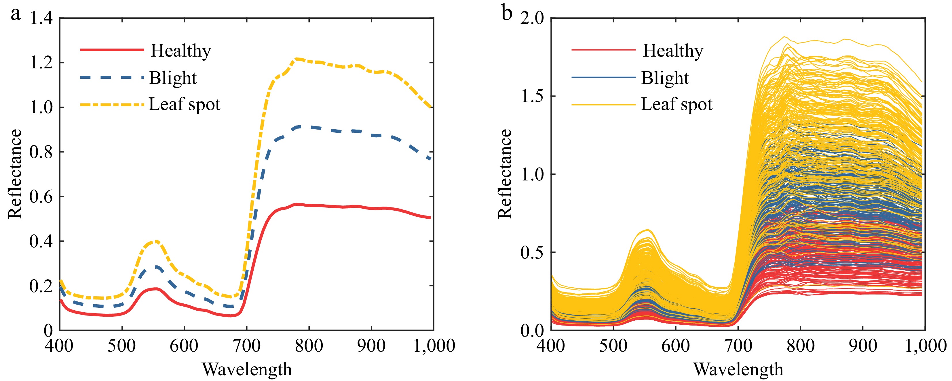 The wavelength range selected for this study spans 400–1,000 nm. The visible light band (400–700 nm) primarily reflects chlorophyll content and the impact of disease on photosynthesis, while the near-infrared band (700–1,000 nm) is sensitive to changes in plant moisture status and structural integrity. This band is particularly responsive to water loss, tissue damage, and other physiological changes in leaves. Tomato leaf spot disease alters the moisture content and cellular structure of leaves, leading to distinct reflectance changes in the near-infrared band compared to healthy leaves. Similarly, wilt disease causes rapid water evaporation from tomato leaves, resulting in reduced water content and lower reflectance in the near-infrared band.