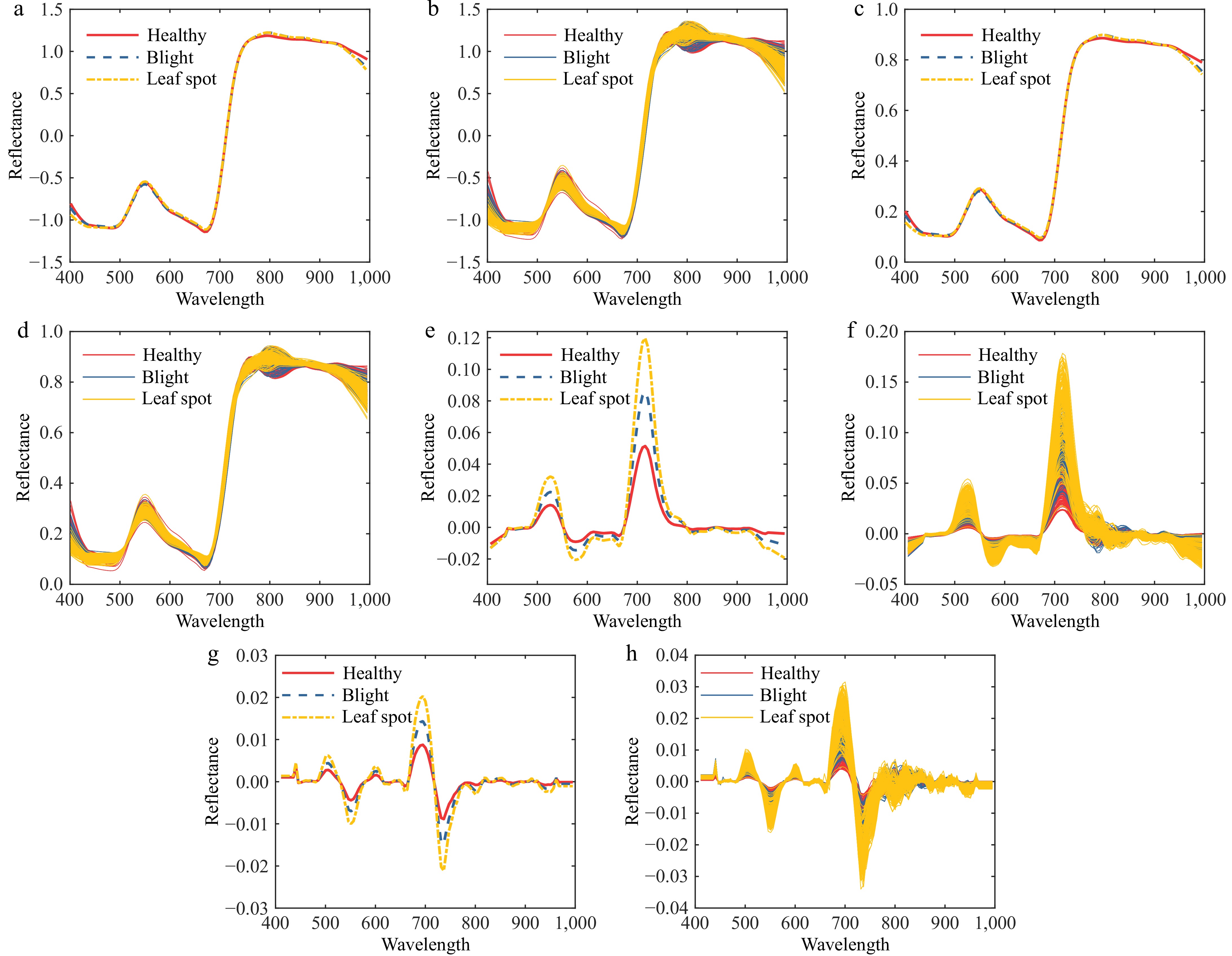 Spectral preprocessing map of diseased tomato leaves. (a) SNV-SG average spectral curve. (b) SNV-SG preprocessing. (c) MSC-SG average spectral curve. (d) MSC-SG preprocessing. (e) 1st Der-SG average spectral curve. (f) 1st Der -SG preprocessing. (g) 2nd Der-SG average spectral curve. (h) 2nd Der-SG preprocessing.
