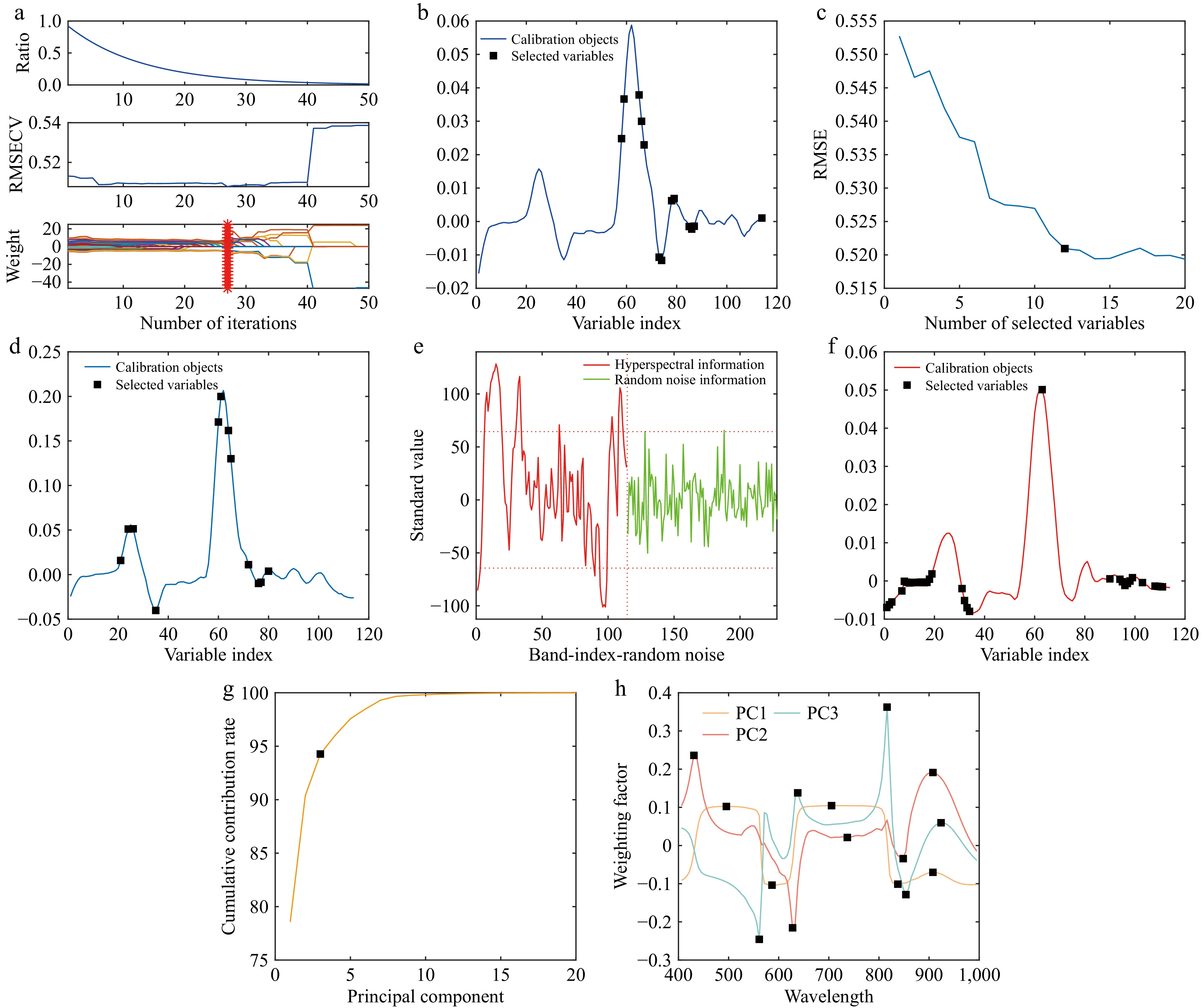 Characteristic wavelength selection. (a) CARS characteristic wavelength selection. (b) Distribution of feature wavelengths. (c) Represents the wavelength retention trend. (d) Distribution of feature wavelengths. (e) Spectral information screening. (f) Distribution of feature wavelengths. (g) Cumulative contribution curve. (h) Weighting factor curves.