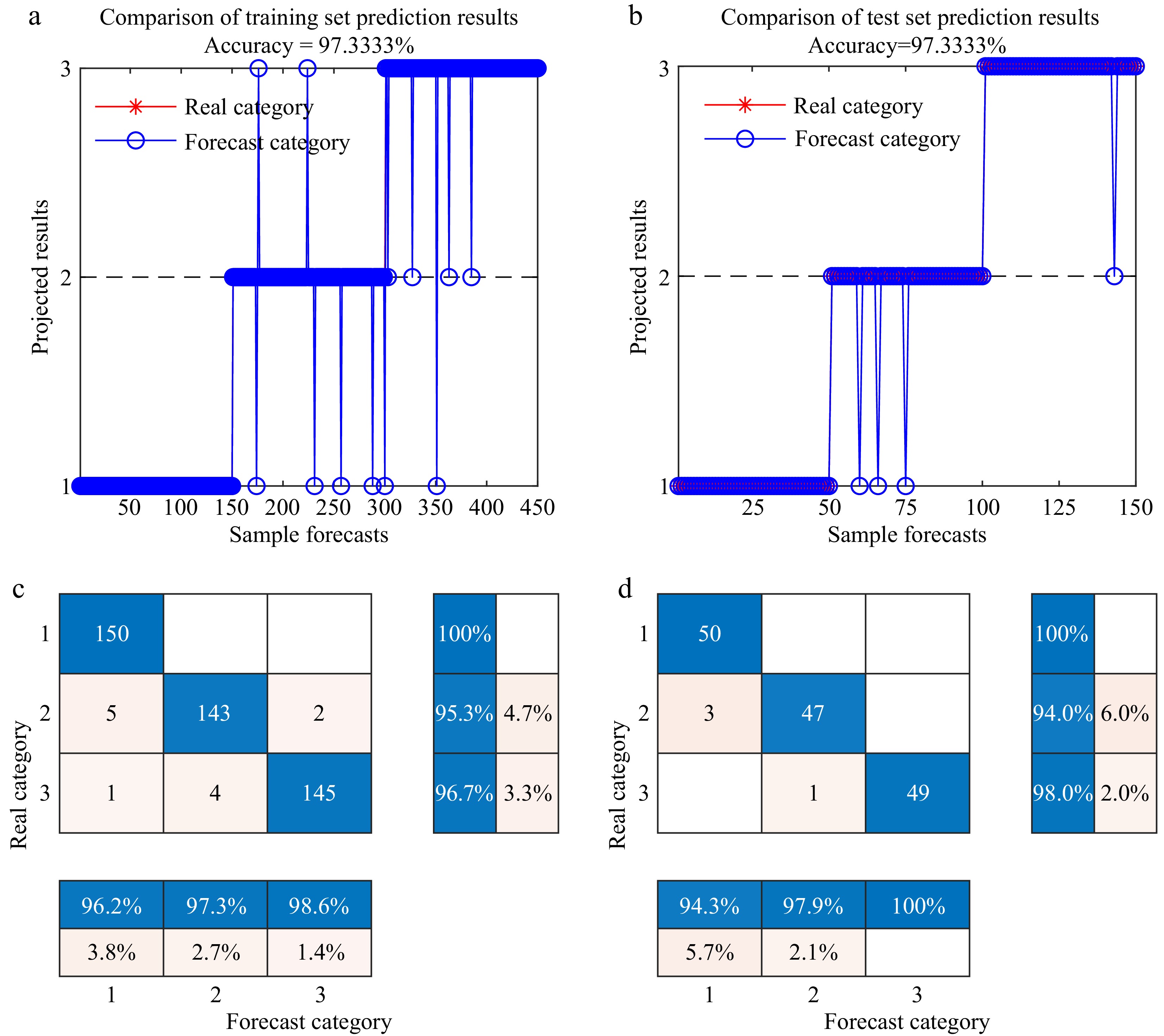 1st Der-SG-UVE--DBO-BiLSTM Detection Classification Result. 1, 2, and 3 represent healthy, infected early wilt, and infected early leaf spot leaves of tomato, respectively. (a) Training set line chart. (b) Test set line chart. (c) Confusion matrix plot for the training set. (d) Confusion matrix plot for the test set.